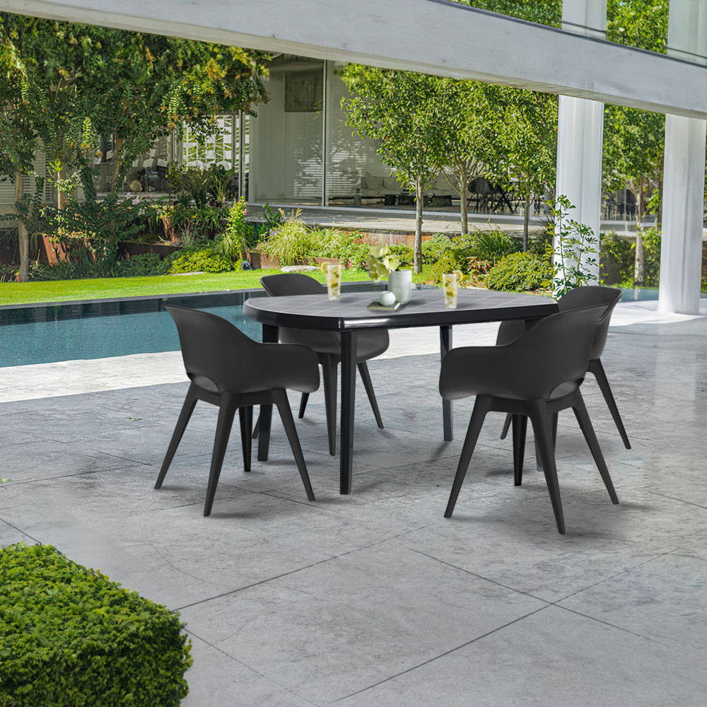 Acest set de mobilier de culoare grafit, confortabil și elegant, include patru bucăți descaune de 57X56X81cm și o masă de137X90X73 cm. Acest set de mobilier de grădină pentru 4 persoane poate fi extrem de benefic dacă doriți să vă bucurați de timpul petrecut în aer liber cu prietenii sau familia.Este un element ideal pentru a vă decora grădina, balconul sau terasa. Forma sa distinctivă și aspectul minimalist îl fac universal și adaptabil la orice amenajare. Setul este o soluție practică pentru a sta în aer liber pe tot parcursul anului, deoarece are o toleranță ridicată și este rezistent la condițiile meteorologice extreme.