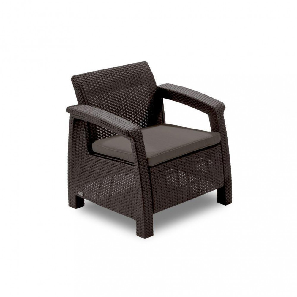 Setul de mobilier de grădină Corfu Weekend Curver combină confortul, eleganța și durabilitatea. Fotoliile și masa sunt maro, în timp ce pernele de șezut sunt disponibile în culoarea taupe. Atât masa, cât și scaunele sunt acoperite cu un model care imită foarte bine ratanul din technoratan. Picioarele joase ale mobilei asigură o stabilitate adecvată, iar pernele tapițate arată excepțional de bine. Masa joasă este foarte funcțională - este suficient de mare chiar și pentru a servi mâncare pe ea. Scaunele sunt confortabile datorită cotierelor late, spătarului înalt și pernelor plate de șezut. Vacanța ta cu setul Corfu Weekend va fi cu siguranță un succes.