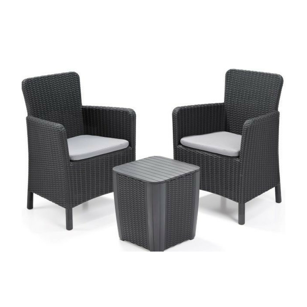 Setul de mobilier de grădină Trenton Balcony este o alegere ideală pentru cei care caută un set de grădină confortabil și elegant pentru un spațiu mic, cum ar fi un balcon sau o terasă. Această piesă de mobilier este elegantă și confortabilă. Designul lor cu efect de ratan în culoarea grafitului este fabricat din plastic rezistent la intemperii de înaltă calitate, așa că poți fi sigur că vor avea o durată lungă de viață și te poți bucura de relaxare în aer liber sau în interior pentru o perioadă lungă de timp.