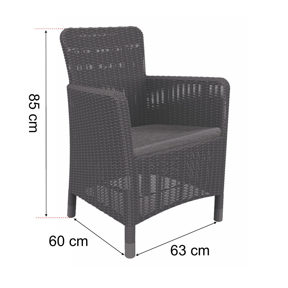 Materiale durabile: Setul este fabricat din plastic durabil și de înaltă calitate, fiind rezistent la deteriorări și la condițiile meteorologice pe termen lung, precum și la radiațiile UV. Datorită culorii sale grafit, tolerează bine murdăria și culoarea sa nu se estompează.