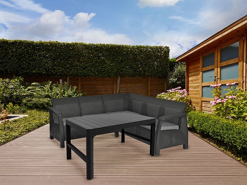 Setul modern de colțar de relaxare Corfu cu masă Lyon combină eleganța și perfecțiunea. Setul include mobilier de culoare grafit cu perne de șezut gri atașate. Nuanțele de gri sunt foarte populare atât în interioare, cât și în grădini - este o combinație plăcută care se îmbină bine cu mediul înconjurător, indiferent de culorile folosite. Mobilierul inclus este acoperit cu un model asemănător poliratanului, care se potrivește bine cu materialul neted al pernelor de șezut. Picioarele mici nu numai că garantează stabilitatea adecvată a mobilei, ci și designul său elegant.