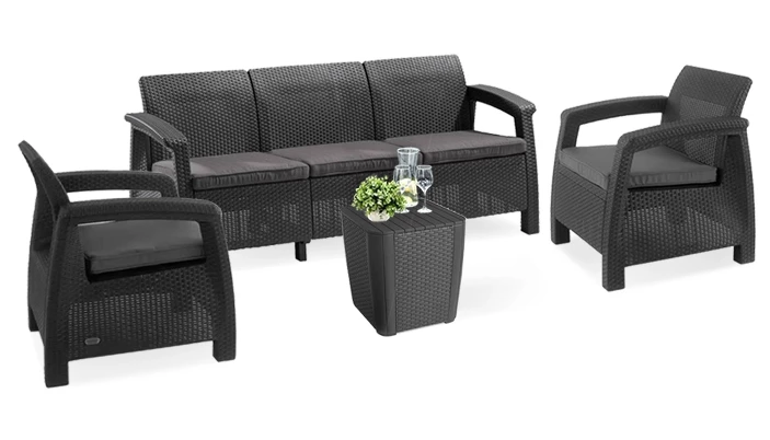 Setul de mobilier de grădină Corfu Love duo este pilonul de aur al grădinii și terasei. Designul său deosebit și aspectul elegant se vor integra perfect în orice mediu. Canapeaua cu trei locuri și cele două fotolii asigură confort 100%. Măsuța mică funcționează perfect și ca spațiu de depozitare. Într-un cuvânt, setul de mobilier de grădină Corfu Love Duo este perfect din toate punctele de vedere.