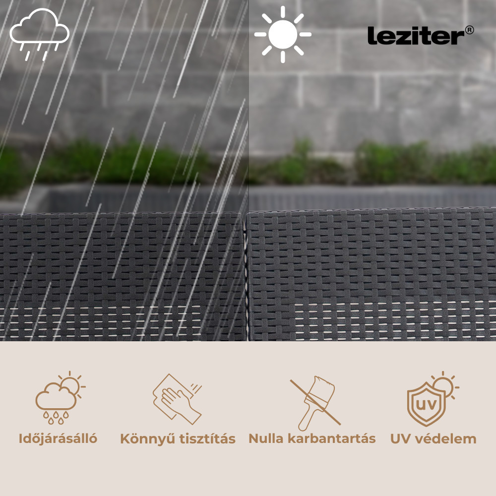 Plastic cu efect de ratan Fabricat din polipropilenă de înaltă densitate , rezistentă la fluctuațiile de temperatură, radiațiile UV și umiditate. Sistemul de asamblare „click-in” conectează elementele în siguranță, fără a fi nevoie de unelte.