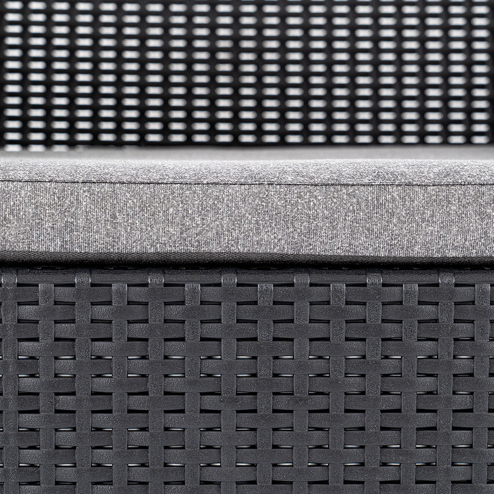 Toate elementele sunt fabricate dintr-un material stabil, durabil și rezistent la UV, iar suprafața cu efect de ratan este elegantă, dar rezistentă la intemperii și ușor de curățat. THE perne groase și gri Acestea oferă un confort suplimentar, astfel încât oaspeții tăi nu vor dori să se ridice.