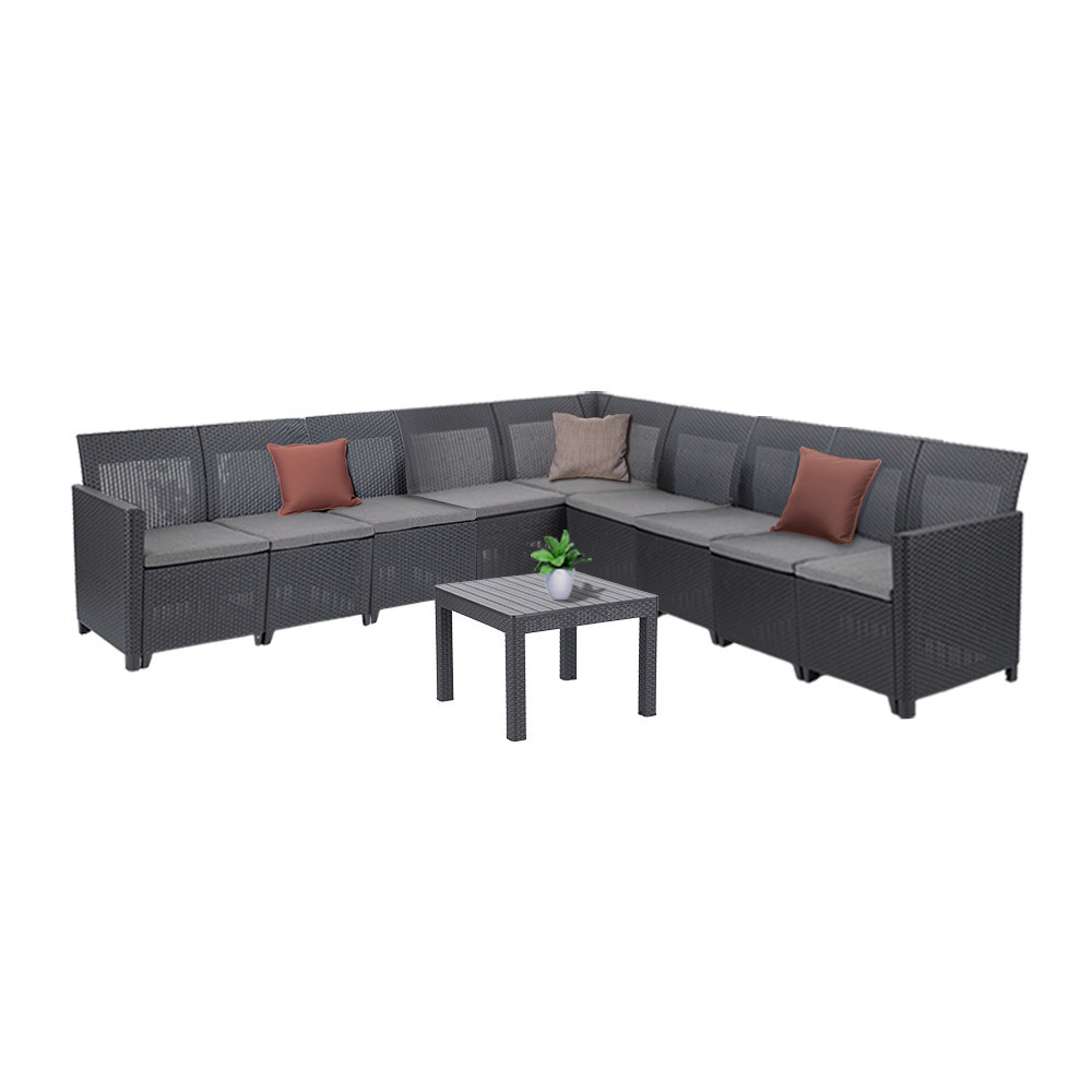Setul Este fabricat din plastic reciclat durabil, turnat pentru a avea un efect de ratan, creând un echilibru între stil și durabilitate. Pernele și cadrul funcționează într-un sistem ușor reglabil și extensibil – asigurând libertate completă și o durată lungă de viață.