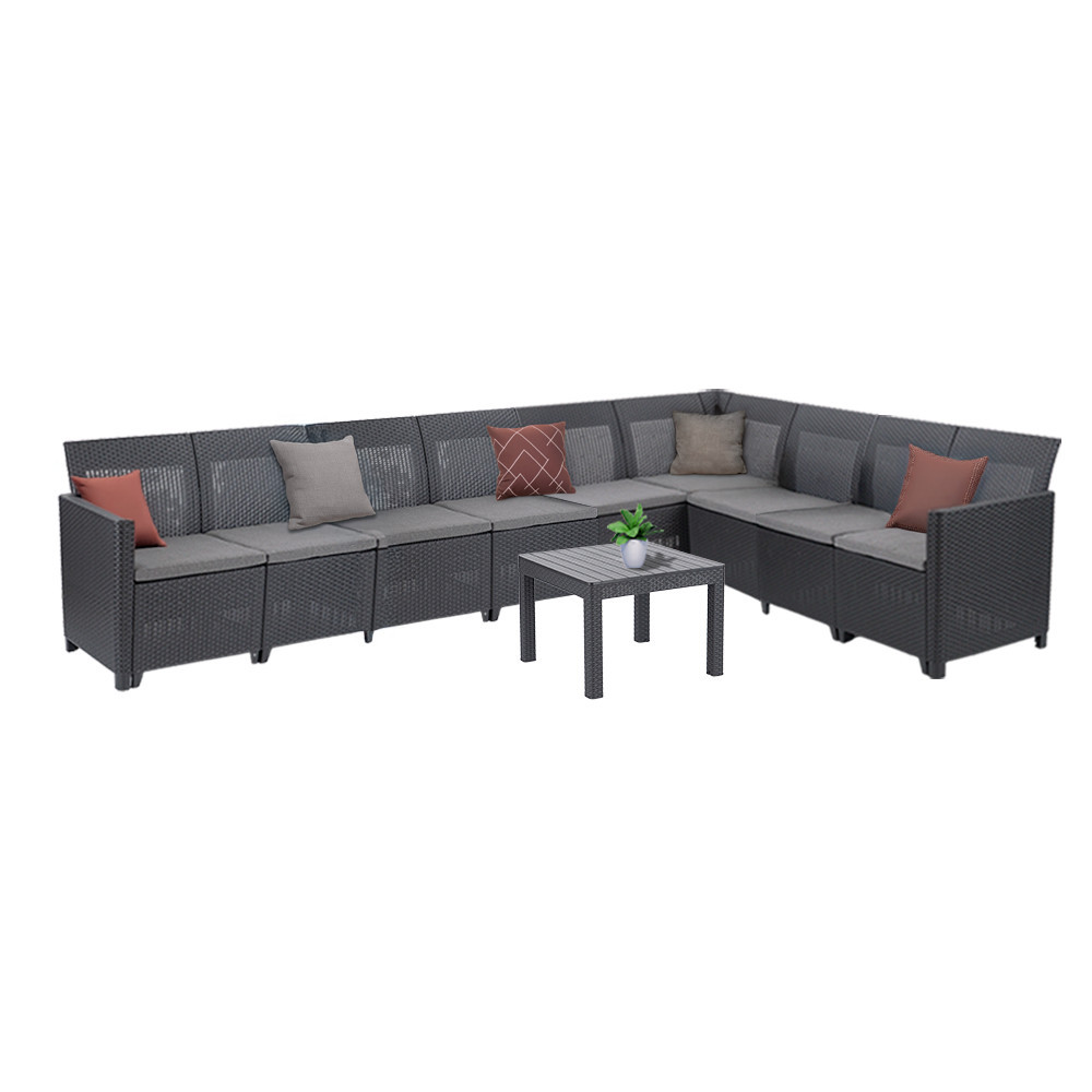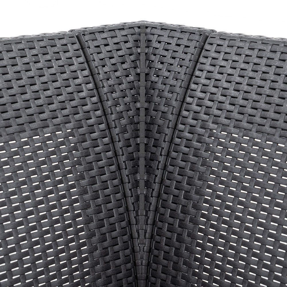 Setul este fabricat din plastic reciclat durabil, turnat pentru a avea un efect de ratan, creând un echilibru între stil și durabilitate. Pernele și cadrul funcționează într-un sistem ușor reglabil și extensibil – asigurând libertate completă și o durată lungă de viață.