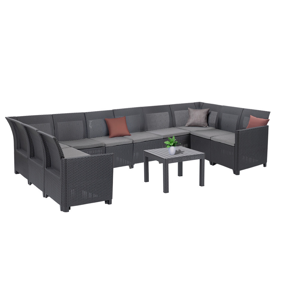O familie de mobilier de exterior modular (adică extensibil, rearanjabil și variabil, cu cotiere detașabile) concepută pentru 10 persoane, realizată din plastic cu efect de ratan , dar rezistent la intemperii .