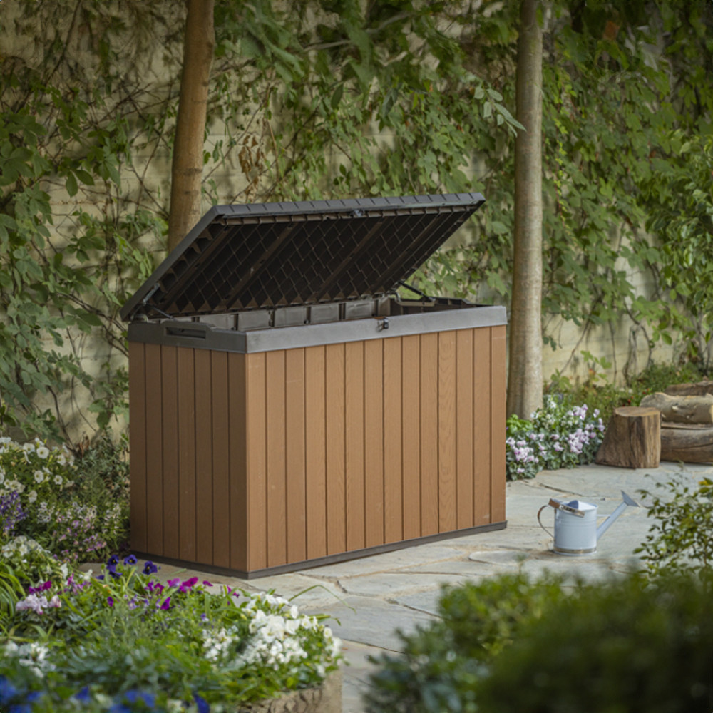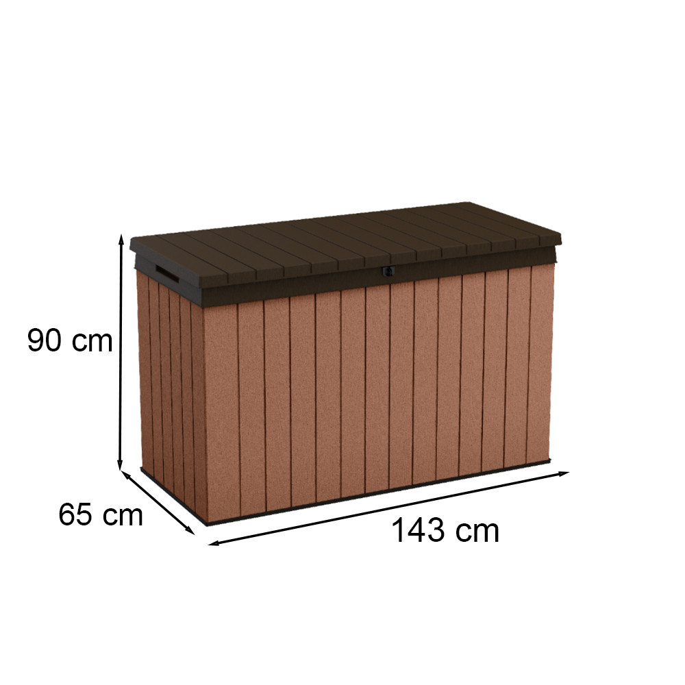 Lada de grădină Darwin de 662L, cu capacitate mare , este o soluție excelentă pentru ascunderea uneltelor de grădină, a pernelor și a echipamentului sportiv în grădină sau pe terasă. Dimensiunile cutiei de depozitare - 143 cm lățime , 65 cm adâncime și 90 cm înălțime - oferă suficient spațiu pentru proviziile de grădină.