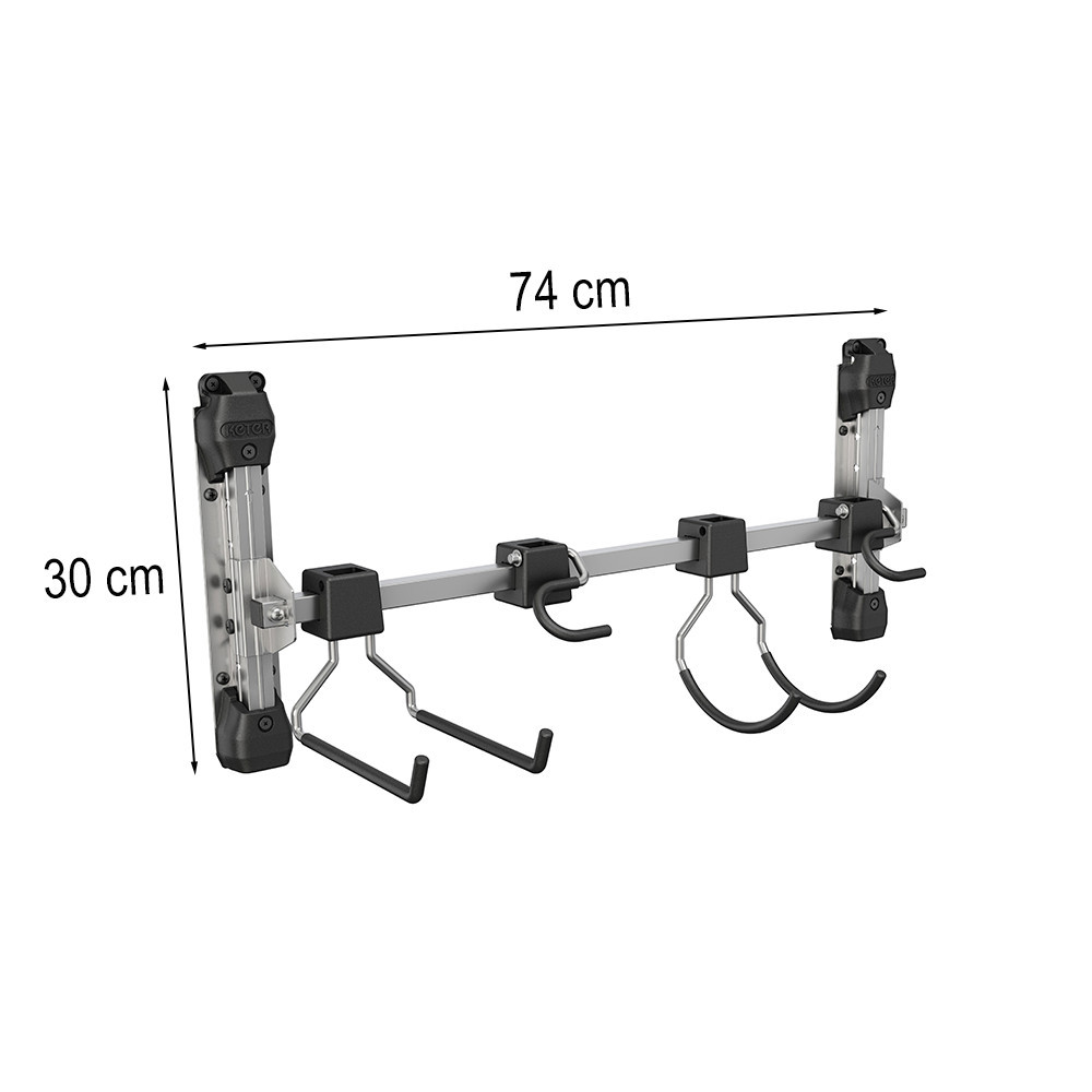 Cu suportul de perete multifuncțional poți uita de toate acestea. Fabricat din oțel galvanizat durabil, poate susține până la 36 kg — 9 kg per cârlig. Cele patru cârlige reglabile au un înveliș de cauciuc pentru a proteja mânerele uneltelor. Suportul de perete cu o lungime de 74 cm și o înălțime de 30 cm poate fi ușor înșurubat pe peretele garajului, atelierului sau șopronului de grădină. Gata cu dezordinea, doar ordine și transparență!
