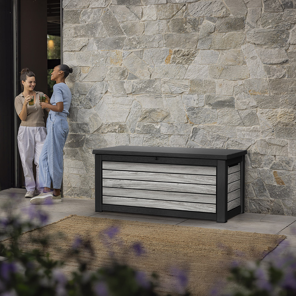 Modelul de lemn cu tehnologie DecoCoat™ conferă lăzii un aspect natural, în timp ce nuanța gri furtună oferă un aspect curat și modern. De asemenea, designul se potrivește bine cu terasele contemporane, mediile pavate și decorul minimalist al grădinii.
