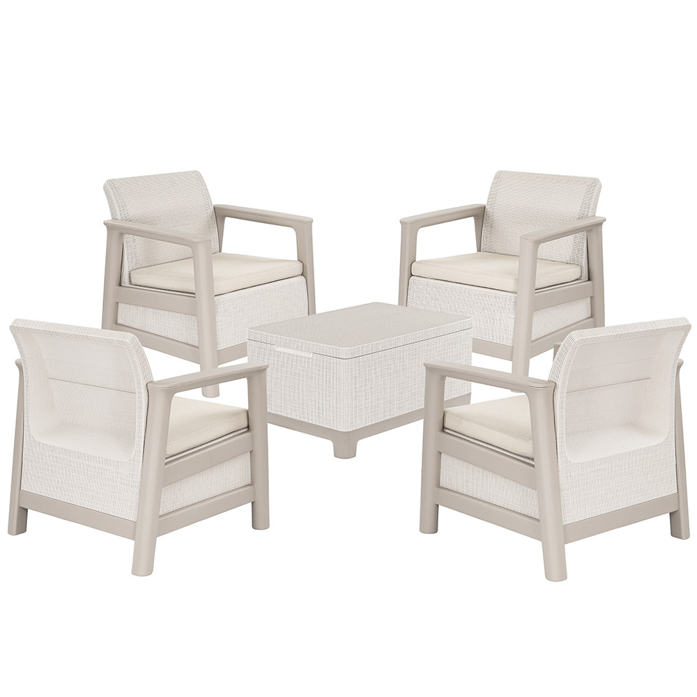 Setul de mobilier de grădină Scandi Quartet set oferă un aspect curat și unitar grădinii sau terasei dumneavoastră. Culoarea gri-bej pietriș are un efect natural, îmbinându-se bine cu împrejurimile verzi și pavajul modern. Împreună, cele 4 fotolii și masa de depozitare creează un set de scaune de exterior confortabil și compact pentru relaxare și divertisment.