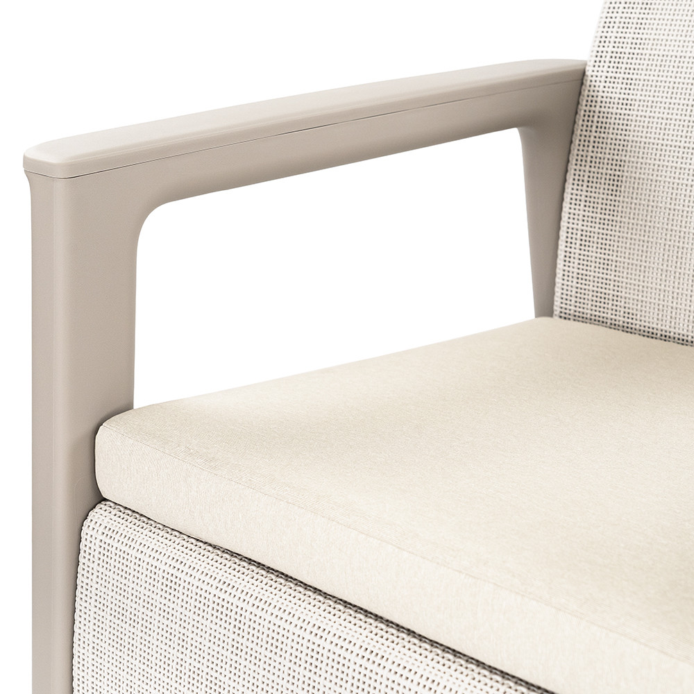Structura robustă a picioarelor și designul cotierelor oferă un suport confortabil. Fotoliul oferă o poziție de ședere proporțională și bine utilizată. O alegere durabilă de mobilier de grădină pentru utilizarea zilnică.