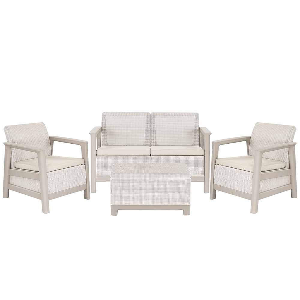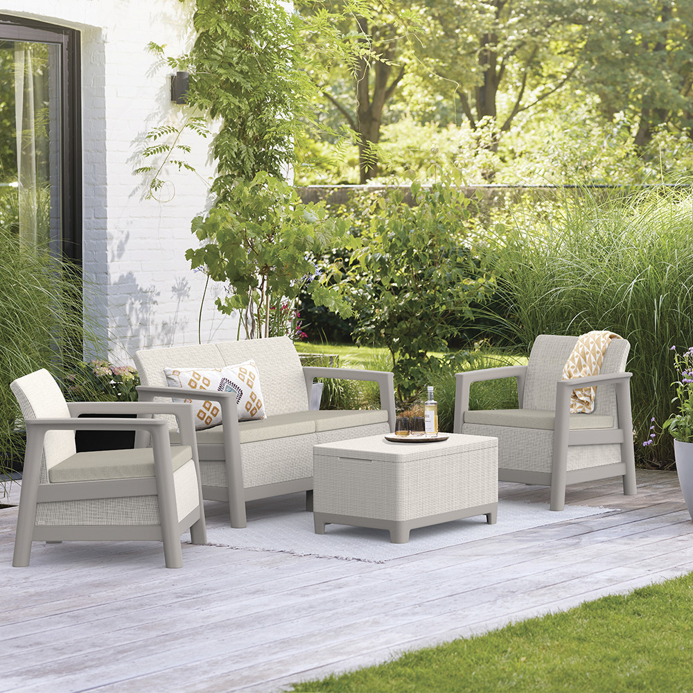 Setul creează o zonă de conversație confortabilă în grădină sau pe terasă. Creează o zonă de living unificată și modernă în aer liber, în timp ce masa de depozitare oferă un loc la îndemână pentru accesorii. O soluție rezistentă la intemperii, fără întreținere, care creează un spațiu exterior îngrijit și grijuliu.