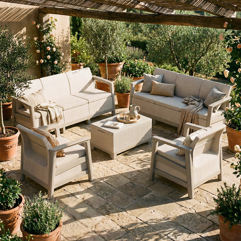 Set de mobilier de grădină Scandi Love max linea duo cu masă de depozitare din iută - gri-bej pietriș