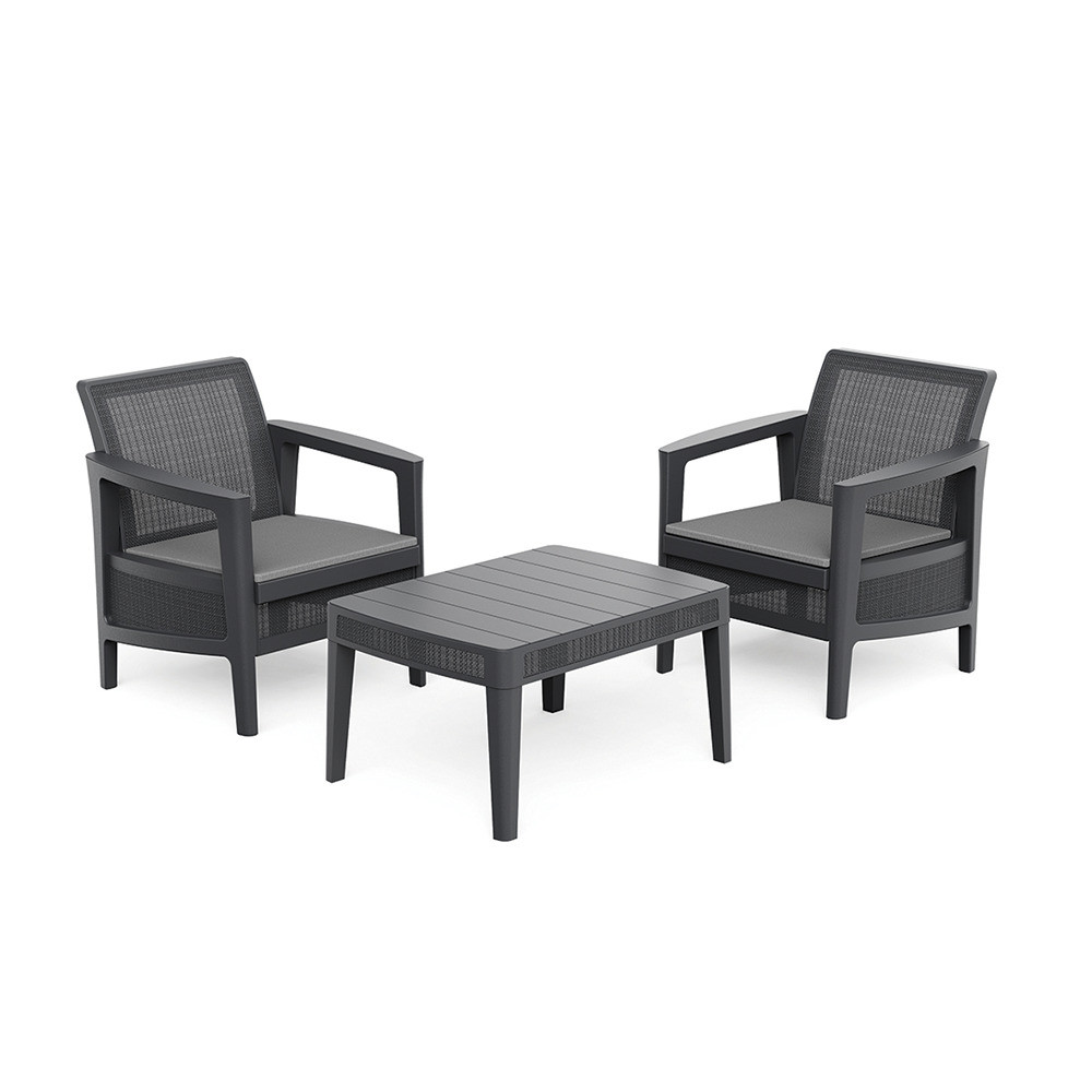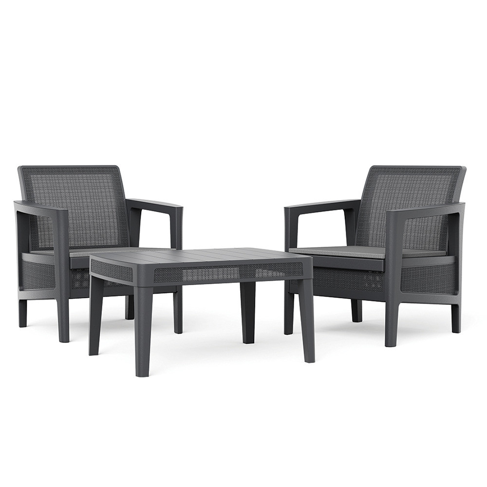 Cele două fotolii și măsuța de cafea asortată oferă un aranjament armonios și compact. Suprafața de ședere capitonată contribuie la senzația de confort, făcând setul potrivit pentru conversații mai lungi, cafea sau relaxare seara. Nuanța gri grafit îi conferă un aspect modern, curat, care poate fi ușor asortat la o varietate de interioare de exterior.