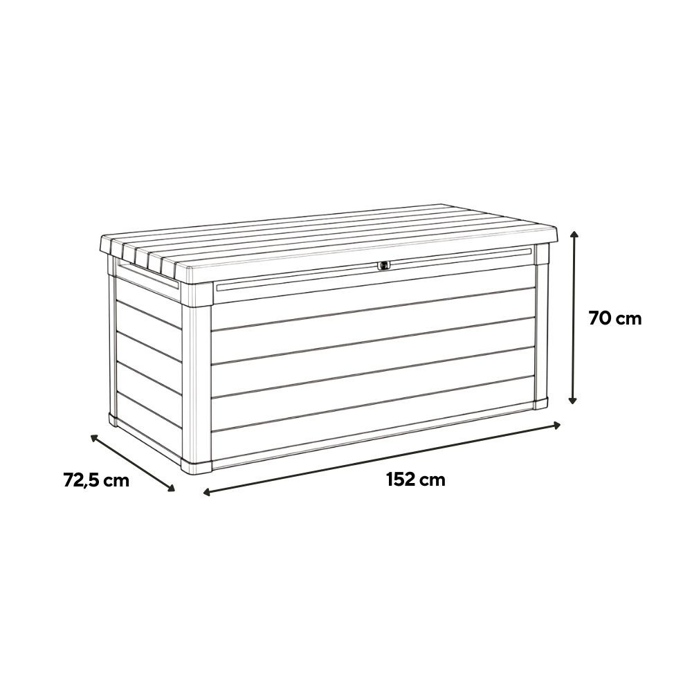 Ladă de grădină din plastic Decocoat 570 L lemn de frasinDate totale despre produsDenumirea produsului: Ladă de grădină din plastic Decocoat 570 L lemn de frasinCapacitate: 570 litriCuloare: lemn de frasinSuprafață: panouri cu efect de lemn cu tehnologie DecoCoat™Material: finisaj din plasticDesign: acoperiș cu balamale, capac blocabilDimensiuni externe: 152 × 72,5 × 70 cmLadă de grădină din plastic de 570 de litri pentru depozitare ordonată în aer liberLada Decocoat Plastic Garden Crate 570 L din lemn de frasin este soluția ideală pentru depozitarea unor cantități mari de perne, pături, unelte de grădină sau accesorii pentru piscină. Capacitatea de 570 de litri oferă spațiu amplu pentru depozitarea organizată a accesoriilor utilizate pe terasă sau în grădină. Acoperișul cu balamale oferă acces rapid și convenabil la articolele depozitate.Cutie modernă de depozitare pentru grădină din lemn de frasin cu efect de lemn naturalFinisajul DecoCoat™ cu efect de lemn conferă lăzii un aspect estetic. Nuanța lemnului de frasin îi conferă un caracter curat, modern, care se potrivește bine cu mobilierul de grădină contemporan și cu decorul minimalist al terasei.Depozitare practică în aer liber pentru terasă și grădinăConstrucția robustă și designul proporționat permit cufărului de grădină să fie bine plasat pe o terasă mai mare, în grădină sau chiar într-o zonă acoperită în aer liber. Capacul blocabil ajută la păstrarea în siguranță a obiectelor depozitate, în timp ce capacitatea mare ajută la crearea unui mediu exterior ordonat și transparent.Pentru cine este recomandată lada de grădină din plastic Decocoat 570 L lemn de frasinRecomandată pentru oricine caută o ladă de grădină din plastic de 570 litri pentru a depozita perne, accesorii de sezon și unelte de grădină mai mari. Ideal pentru terase de dimensiuni medii și mari, grădini de case de familie unde depozitarea ordonată și aspectul estetic sunt importante.