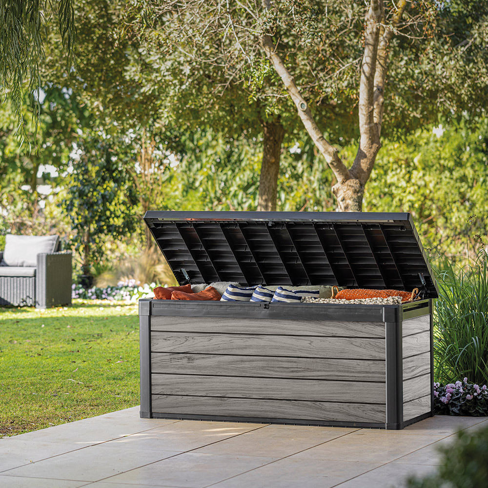 Ladă de grădină din plastic Decocoat 570 L gri furtună Date totale despre produsDenumirea produsului: Ladă de grădină din plastic Decocoat 570 L gri furtunăCapacitate: 570 litriCuloare: gri furtunăSuprafață: panouri cu efect de lemn cu tehnologie DecoCoat™Material: finisaj din plasticDesign: acoperiș cu balamale, capac blocabilDimensiuni externe: 152 × 72,5 × 70 cmLadă de grădină din plastic de 570 de litri pentru depozitare ordonată în aer liberLada de grădină din plastic Decocoat 570 L în gri furtună este soluția ideală pentru depozitarea unor cantități mari de perne, pături, unelte de grădină sau accesorii pentru piscină. Capacitatea de 570 l oferă spațiu amplu pentru depozitarea organizată a accesoriilor pentru terasă sau grădină. Capacul cu balamale oferă acces rapid și convenabil la articolele depozitate.Cutie de depozitare modernă de grădină gri furtună cu finisaj din lemn naturalFinisajul DecoCoat™ cu efect de lemn conferă lăzii un aspect estetic. Nuanța gri furtună îi conferă un caracter curat, modern, care se potrivește bine cu mobilierul de grădină contemporan și cu decorul minimalist al terasei.Depozitare practică în aer liber pentru terasă și grădinăConstrucția robustă și designul proporționat permit cufărului de grădină să fie amplasat cu ușurință pe o terasă mare, într-o grădină sau chiar într-o zonă acoperită în aer liber. Capacul blocabil ajută la păstrarea în siguranță a obiectelor depozitate, în timp ce capacitatea mare ajută la crearea unui mediu exterior ordonat și transparent.Pentru cine este recomandată lada de grădină din plastic Decocoat 570 L gri furtunăRecomandată pentru oricine caută o ladă de grădină din plastic de 570 litri pentru a depozita perne, accesorii de sezon și unelte de grădină mai mari. Ideal pentru terase de dimensiuni medii și mari, grădini de case de familie unde depozitarea ordonată și aspectul estetic sunt importante.