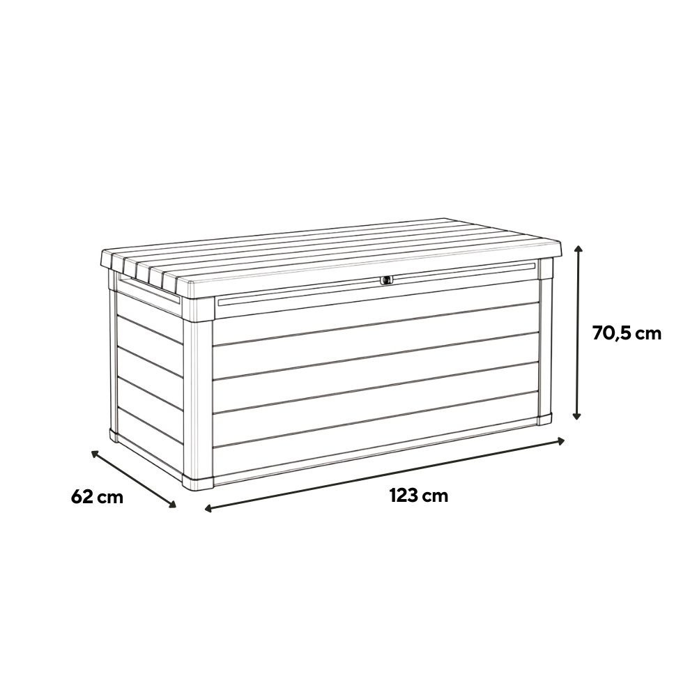 Recomandată pentru oricine caută o ladă de grădină din plastic de 380 litri pentru depozitarea accesoriilor de dimensiuni medii pentru exterior. Ideal pentru terase, grădini mici sau pe marginea piscinei, unde un aspect ordonat și un design estetic cu efect de lemn sunt importante.
