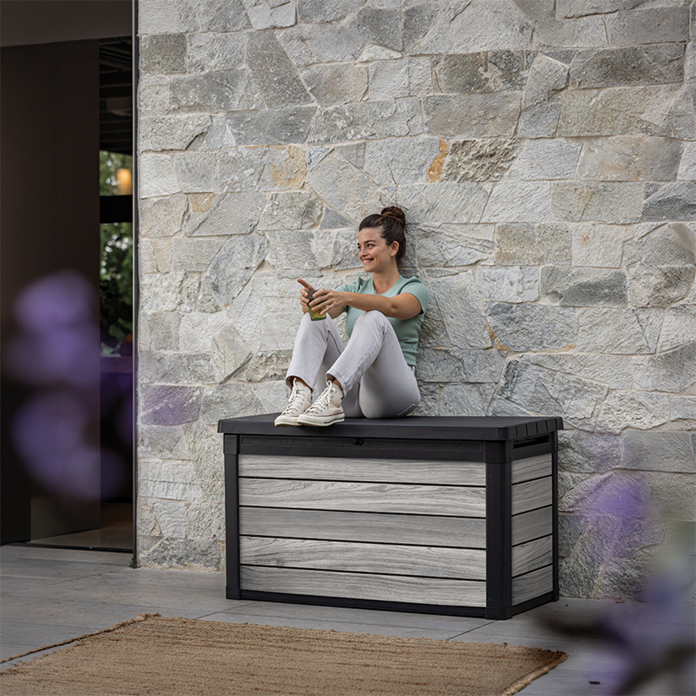 Finisajul DecoCoat™ cu efect de lemn conferă lăzii un aspect estetic. Nuanța gri furtună îi conferă un caracter curat și atemporal, care se îmbină armonios cu terasele moderne, împrejurimile verzi și designul minimalist al grădinilor.
