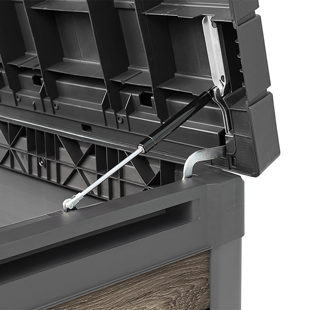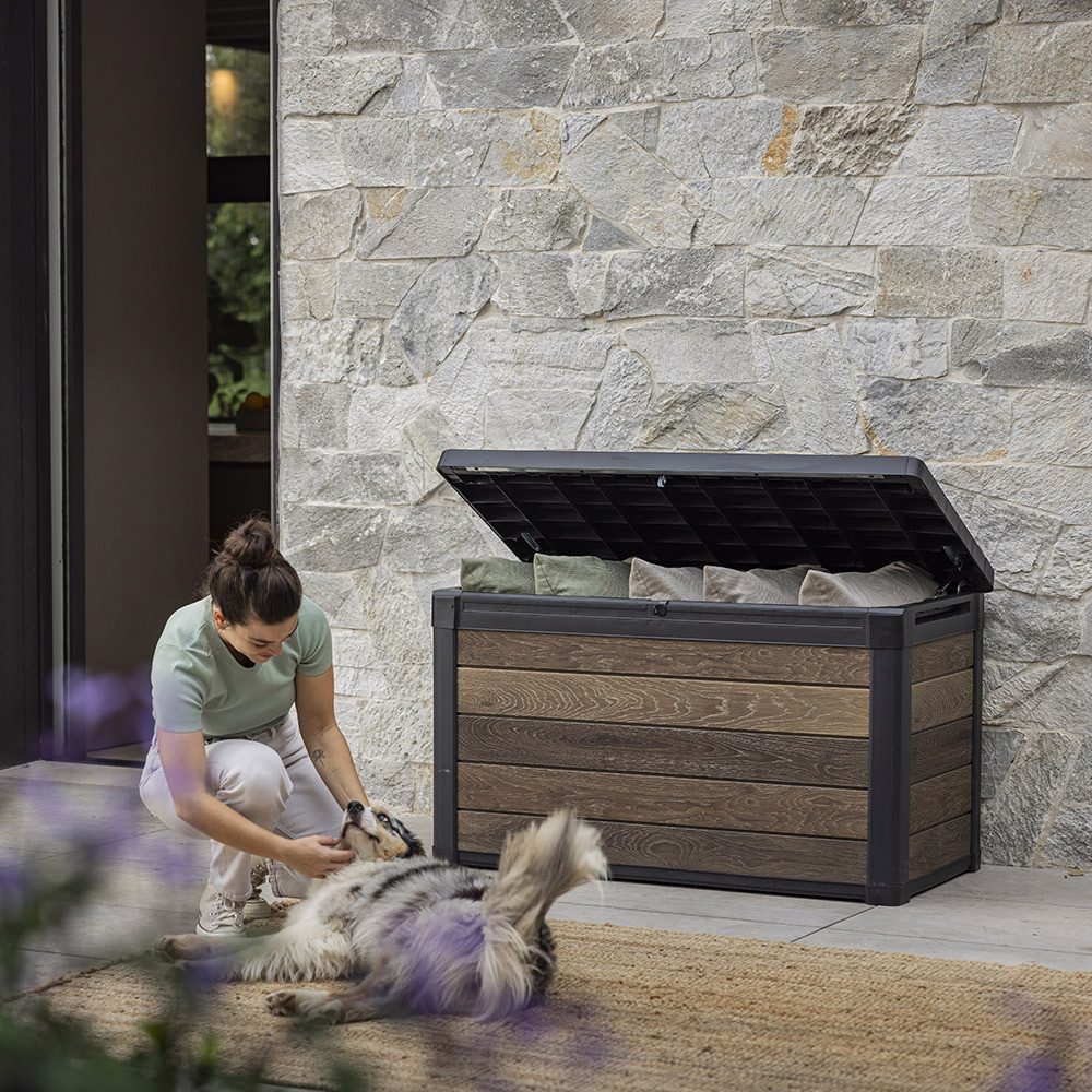 Recomandată pentru oricine caută o ladă de grădină din plastic de 380 de litri pentru depozitarea accesoriilor de dimensiuni medii pentru exterior. Ideal pentru terase, grădini mici sau pe marginea piscinei, unde un aspect ordonat și un design estetic cu efect de lemn sunt importante.