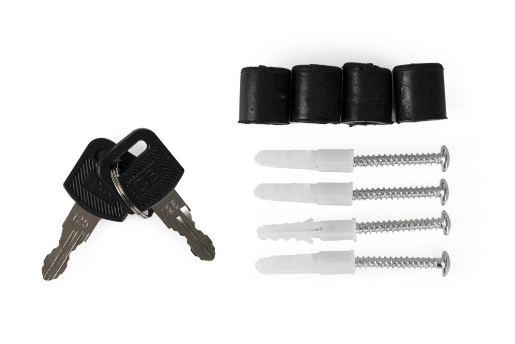 Împreună cu cutia, veți primi un set de asamblare - 4 pini și distanțiere, astfel încât să puteți începe instalarea cutiei imediat după despachetare. Setul include două chei pentru deschiderea cutiei.