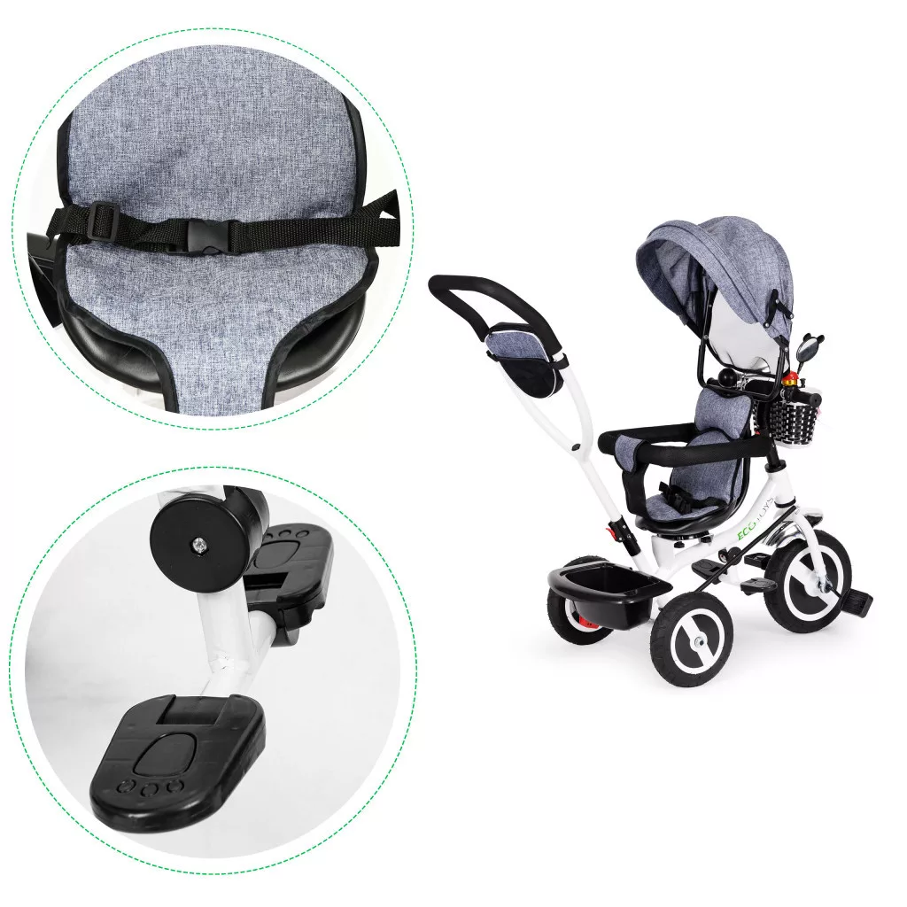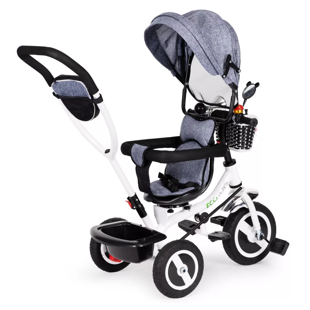 Bicicleta ECOTOYS combină o serie de soluții practice pentru a oferi copilului dvs. o joacă confortabilă și sigură. Bicicleta are un spătar moale și confortabil care îi permite copilului dvs. să stea confortabil, iar centurile și șinele îl împiedică să cadă de pe scaun. Acoperișul pliabil protejează de ploaie și soare. Cadrul special profilat și **scaunul rotativ** facilitează urcarea celor mai mici copii.
