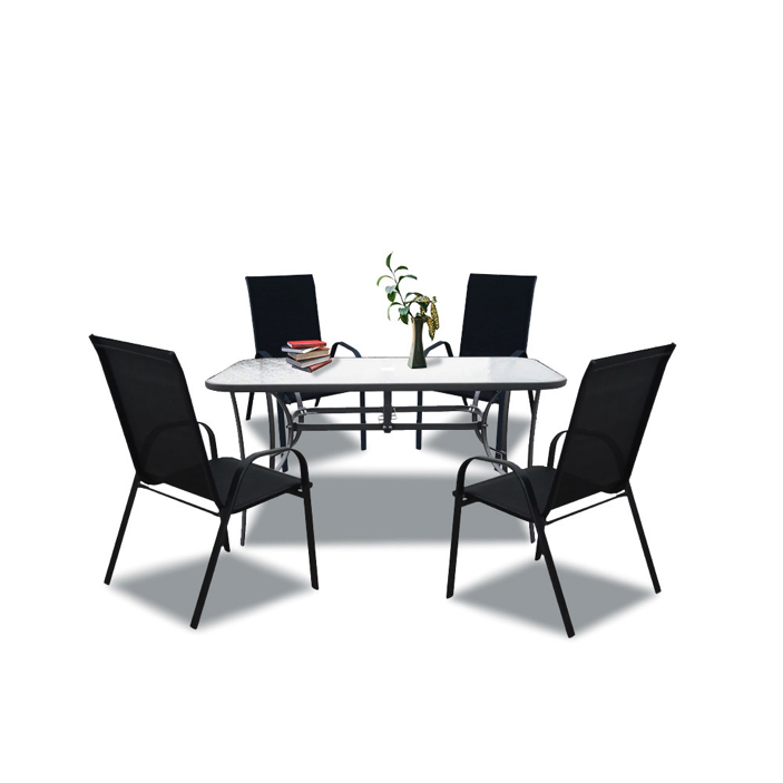 Acest set modern de mobilier de grădină include o masă de grădină cu blat din sticlă și 4 scaune cu o capacitate de încărcare de 120 kg. Mobilierul este proiectat pentru 4 persoane. Scaunele și baza mesei sunt fabricate din metal. Blatul mesei este fabricat din sticlă călită de 5 mm, care este rezistentă la zgârieturi minore. Materialul scaunului din textilenă este rezistent la condițiile meteorologice. Acesta are avantajul unui scaun și al unui cotieră profilate ergonomic, care ușurează umerii atunci când vă relaxați.