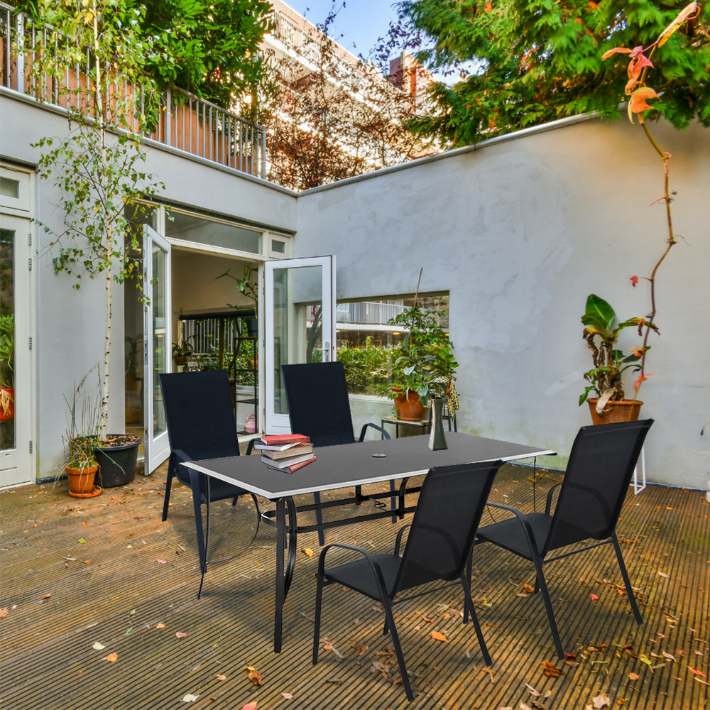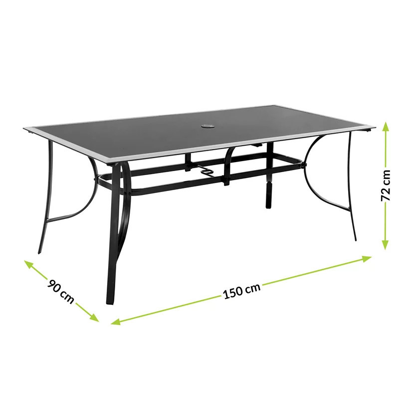 Setul de mobilier este conceput pentru 4 persoane , ceea ce vă permite să îl utilizați în timpul întâlnirilor cu cei dragi. Este proiectat la înălțimea potrivită, astfel încât să puteți lua prânzul sau alte mese confortabil. În structura mesei a fost încorporată o gaură suplimentară pentru a stabiliza umbrela. Designul simplu al picioarelor, distanțate larg, asigură stabilitate.
