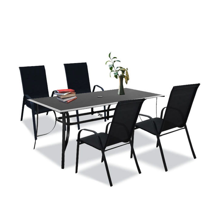 Setul modern de mobilier de grădină include o masă de grădină și 4 scaune. Mobila este concepută pentru 4 persoane . Scaunele și baza mesei sunt fabricate din metal. Materialul șezutului din textilenă este rezistent la intemperii . Avantajul său constă în scaunul și cotierele profilate ergonomic , care ușurează umerii în timpul odihnei.