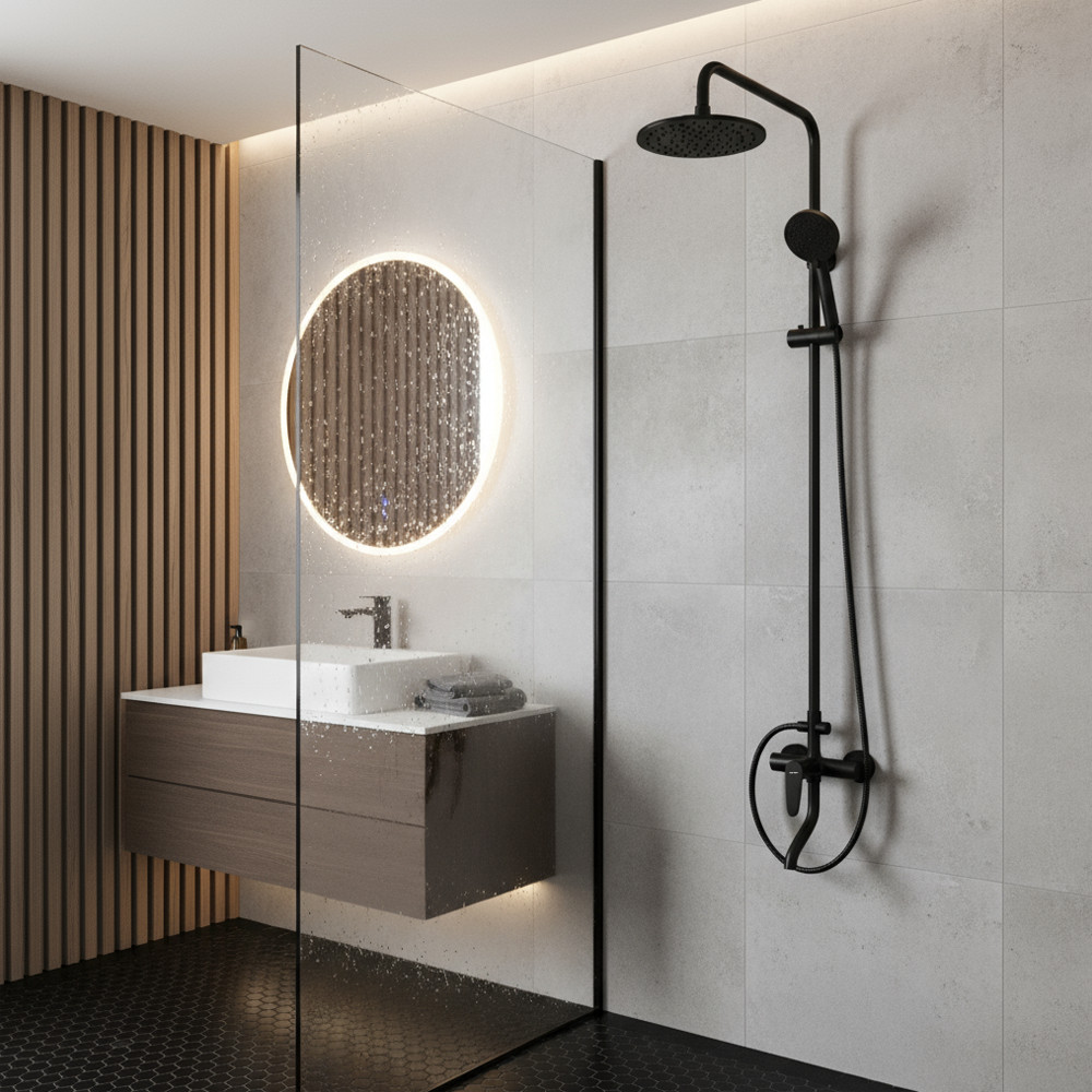 Sistemul de duș negru arată deosebit de bine cu faianța de culoare deschisă, în băile moderne din beton sau cu efect de marmură. Acesta emană forță, claritate și modernitate, creând în același timp un spațiu îngrijit din punct de vedere vizual și cu caracter.