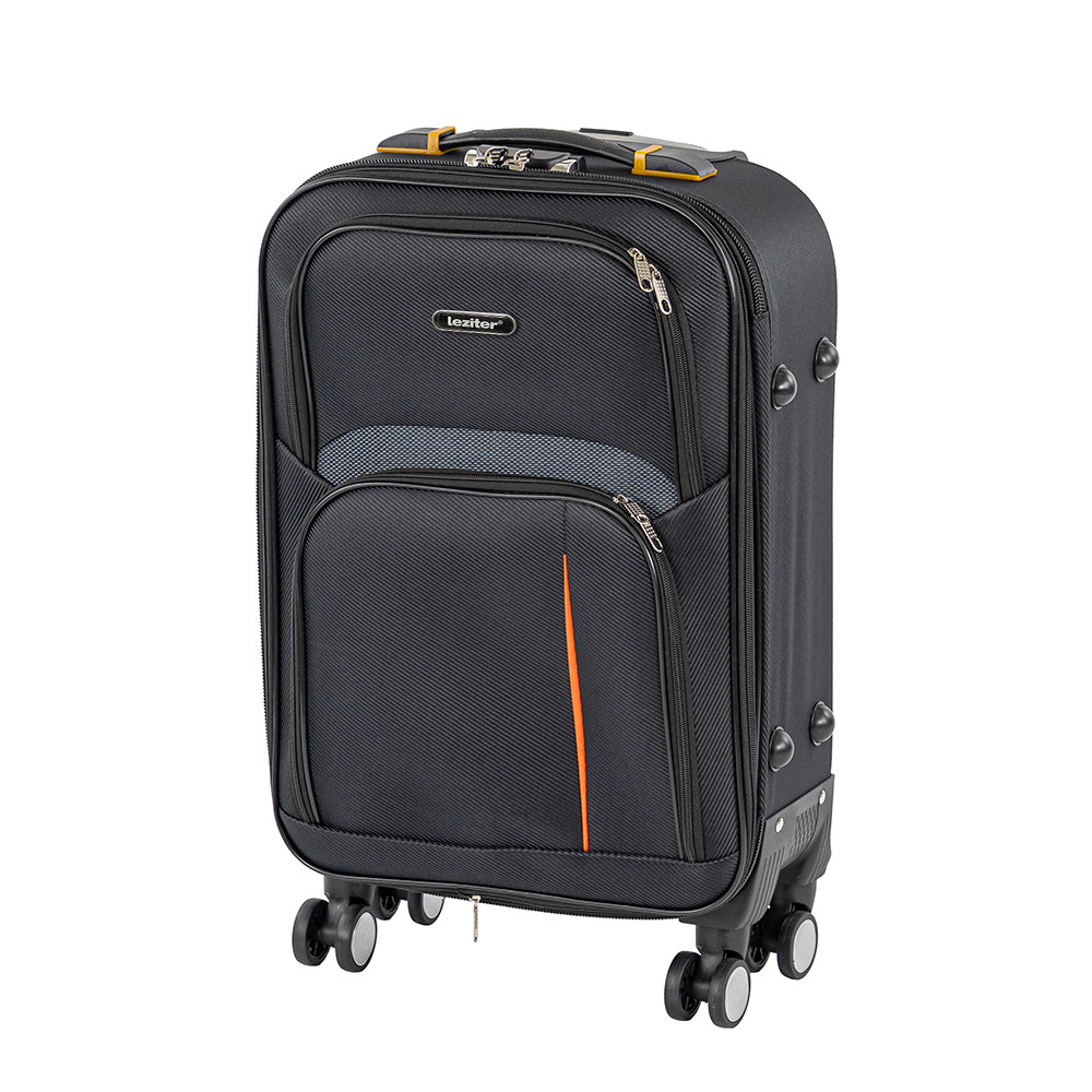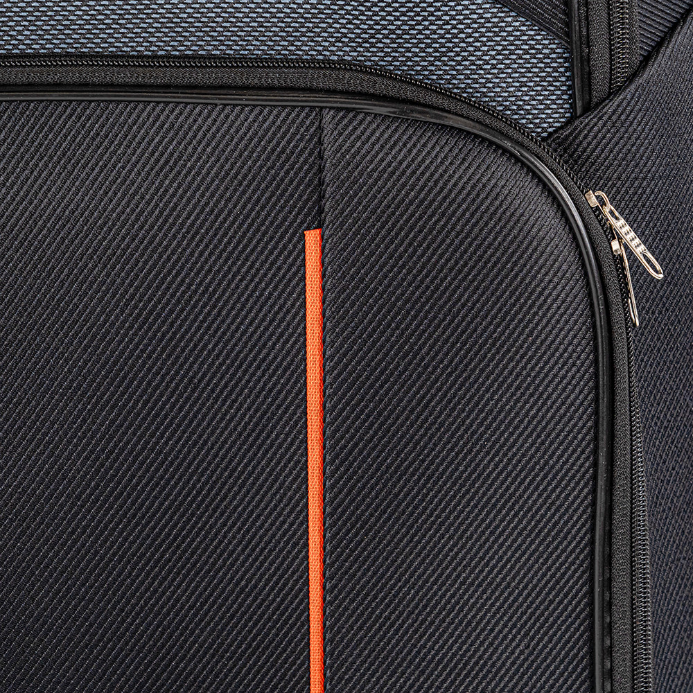 Această valiză reprezintă eleganța minimalistă. Culoarea de bază neagră este întreruptă de o singură dungă decorativă portocalie subtilă, conferind întregului aspect un aspect sportiv și elegant. Îl poți recunoaște ușor la zona de recuperare a bagajelor, nu se contopește cu mulțimea, dar nici nu este ostentativ. Cele două buzunare exterioare nu sunt doar utile, ci și îi întrerup vizual forma. Materialul moale îl face mai ușor decât omologul său cu copertă cartonată, astfel încât o mai mare parte din greutatea permisă merge către lucrurile care contează cu adevărat - nu către valiză în sine.