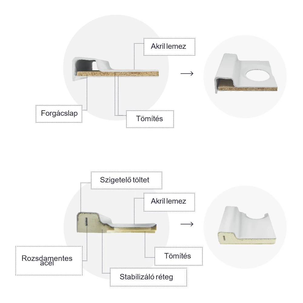● Marmură turnată, compozit: Acestea au un aspect luxos, sunt foarte solide și rezistente la fisuri și zgârieturi. Marmura turnată are o suprafață netedă și reține bine căldura, dar este mai scumpă decât versiunile din acril sau ceramică.