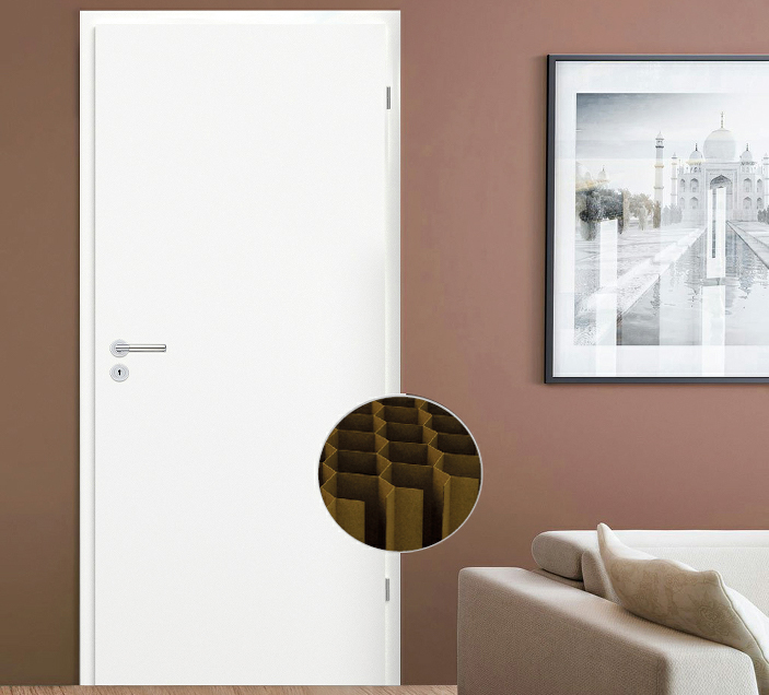Structura panourilor noastre de uși interioare este o grilă de hârtie pliată pe trei laturi , un panou de ușă ranforsat intern cu o suprafață laminată și o încuietoare cu cheie standard. Mânerul ușii nu este inclus în ofertă .