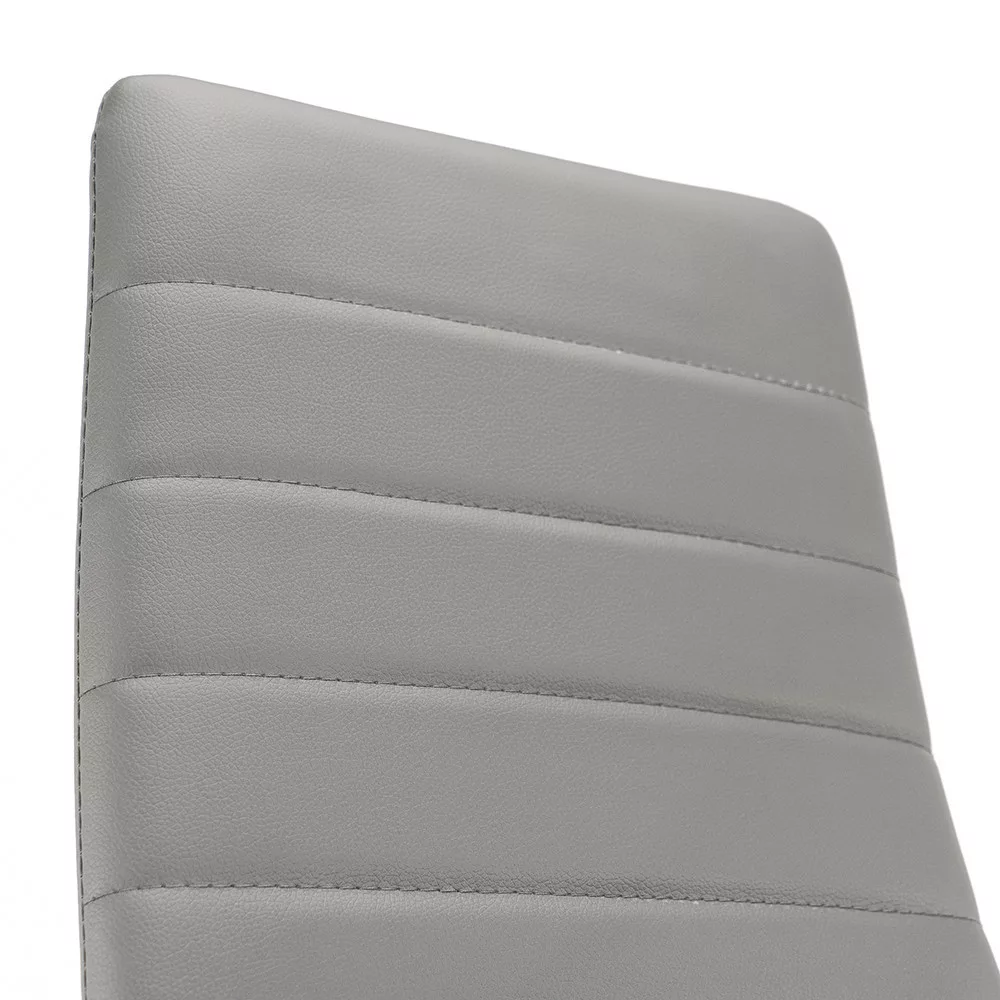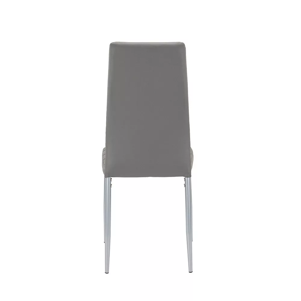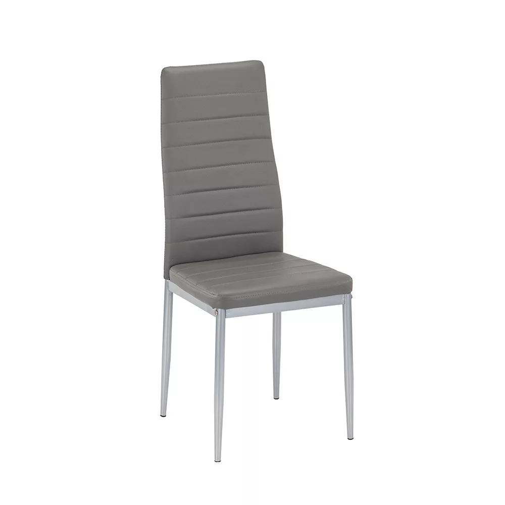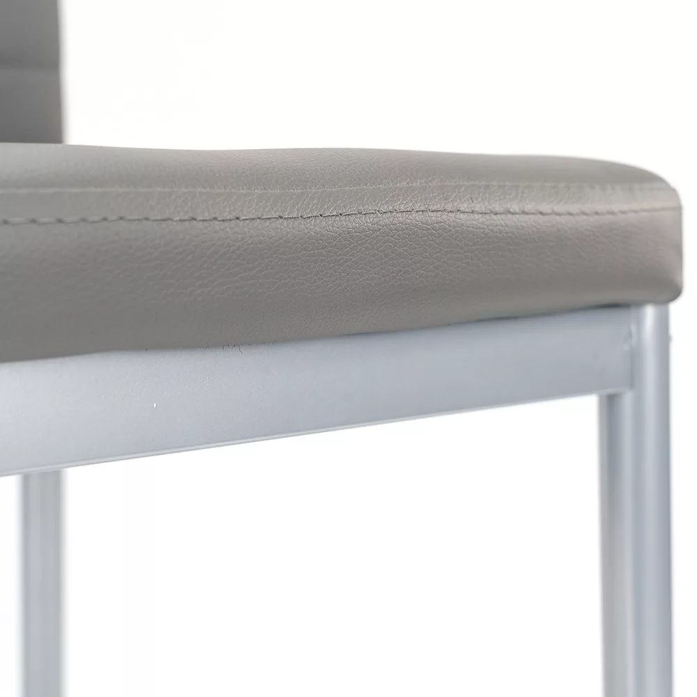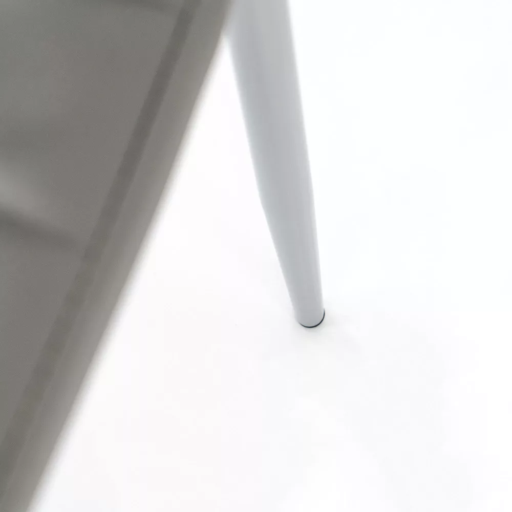 Șezutul și spătarul sunt fabricate dintr-un material rezistent și ușor de curățat, de culoare gri. Picioarele din fier vopsit în câmp electrostatic negru oferă scaunului un suport stabil.