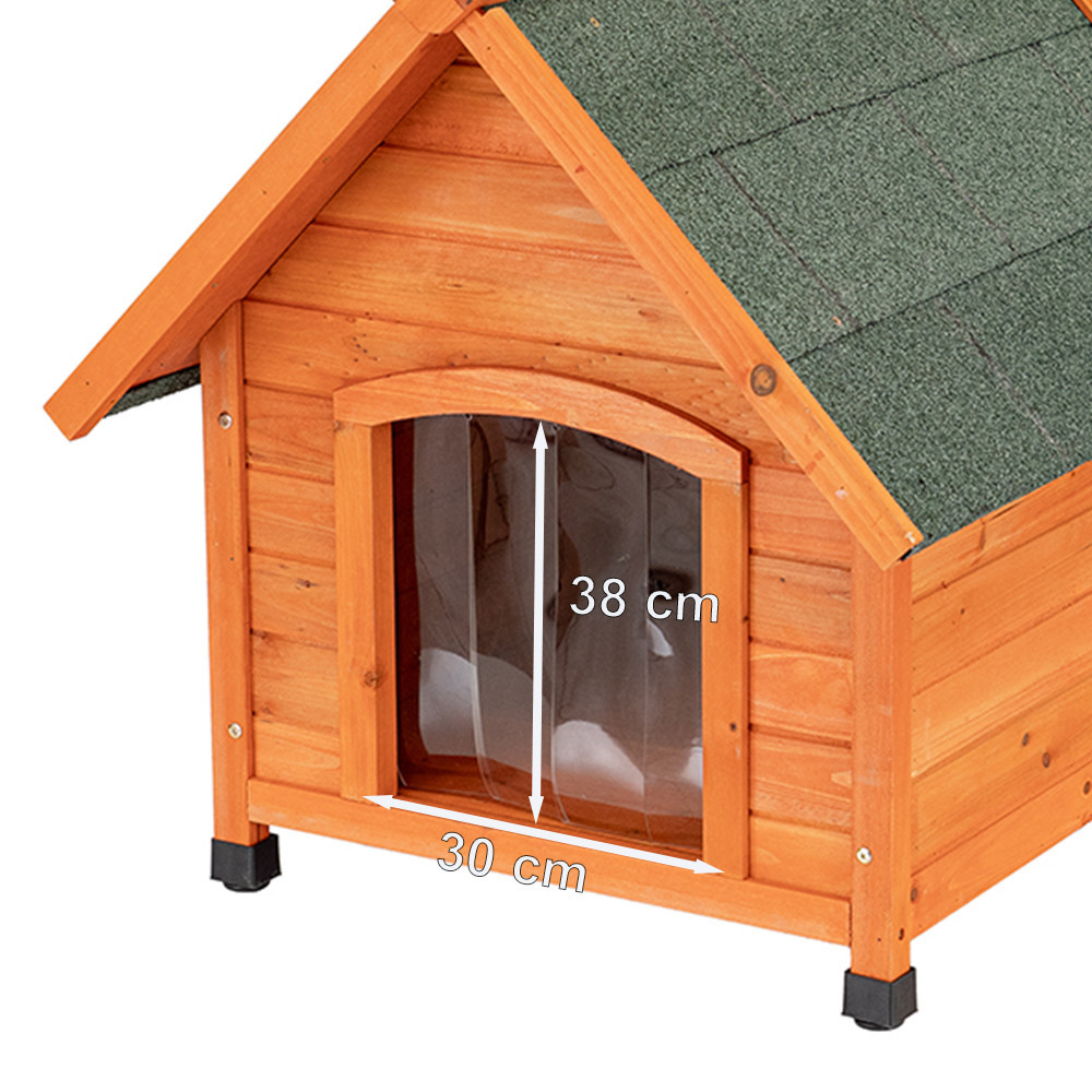 Acoperișul căsuței pentru câini este acoperit cu hârtie gudronată șlefuită, cu aspect de cărămidă, care asigură rezistența la intemperii și oferă protecție suplimentară. Consolele largi ale acoperișului protejează atât părțile exterioare, cât și intrarea de ploaie, vânt și frig. Ușa transparentă cu lamele este ideală pentru vreme ploioasă și protejează împotriva curenților de aer.