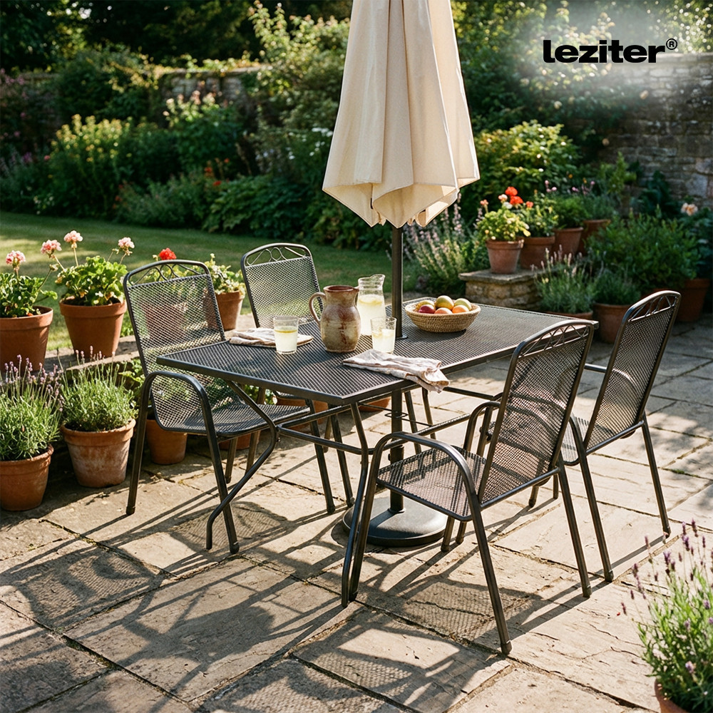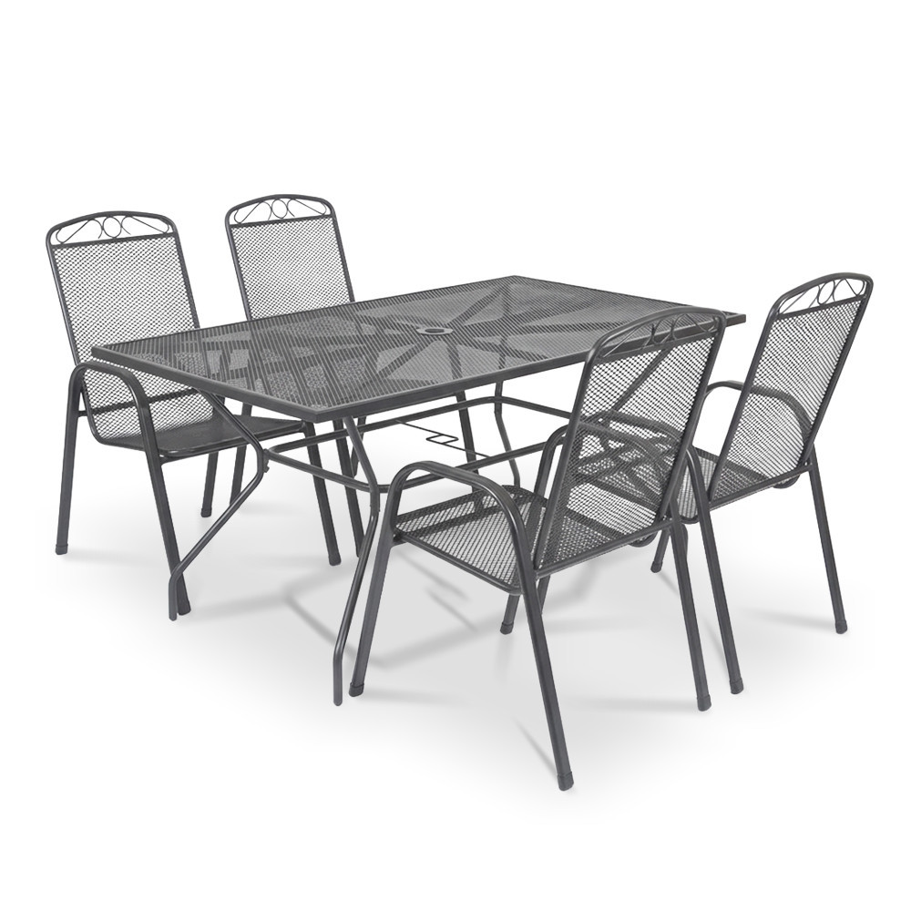 A Melfi 4+1 kerti bútor garnitúra szett antracit színben egy nagyméretű Melfi téglalap alakú kerti asztalt és 4 db kényelmes Melfi karfás széket tartalmaz, stabil acél szerkezetével, korrózióálló és porszórt felületkezelésével, valamint modern hálós kialakításával ideális választás családi étkezésekhez és baráti összejövetelekhez kertben, teraszon vagy erkélyen.