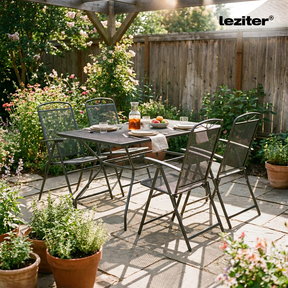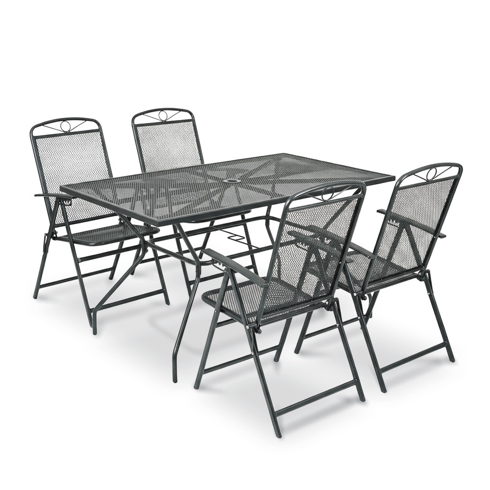 Az Alfi 4+1 kerti bútor garnitúra szett antracit színben egy nagyméretű Melfi téglalap alakú kerti asztalt és 4 db Alba összecsukható kerti széket tartalmaz, stabil acél szerkezetével, korrózióálló és porszórt felületkezelésével, valamint modern hálós kialakításával praktikus és stílusos megoldást kínál kültéri étkezésekhez kertben, teraszon vagy erkélyen.