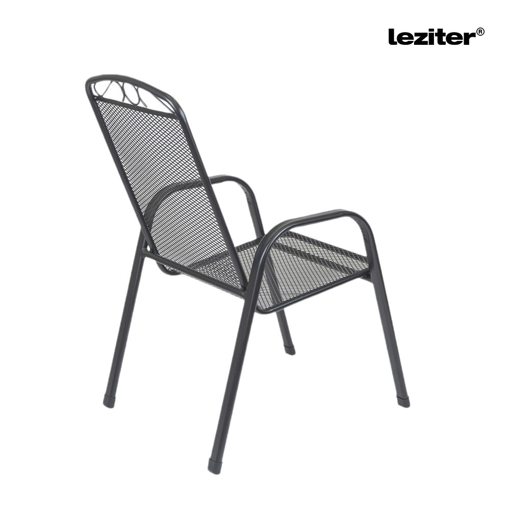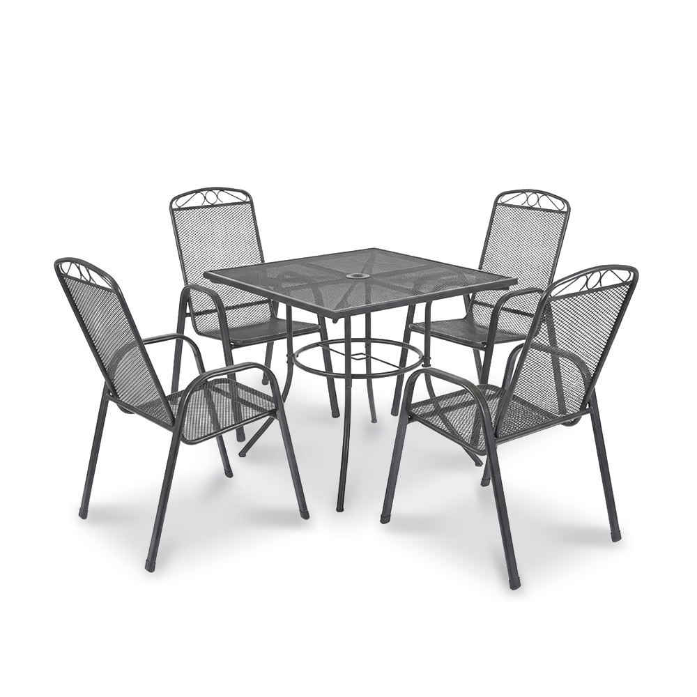 A Leziter Eliza 4+1 kerti bútor garnitúra szett antracit színben egy négyzet alakú Melfi kerti asztalt és 4 db kényelmes Melfi karfás széket tartalmaz, stabil acél szerkezetével, korrózióálló és porszórt felületkezelésével, valamint modern hálós kialakításával tartós és stílusos megoldást kínál kertbe, teraszra vagy erkélyre.