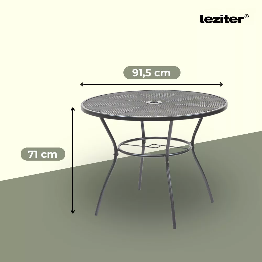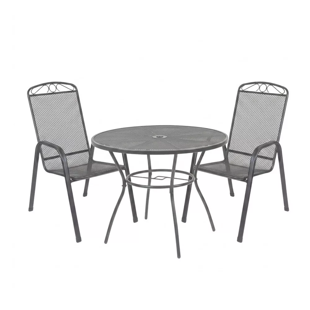 1 masă de grădină rotundă Arko din plasă metalică2 bucăți scaune de grădină Melfi din plasă metalică