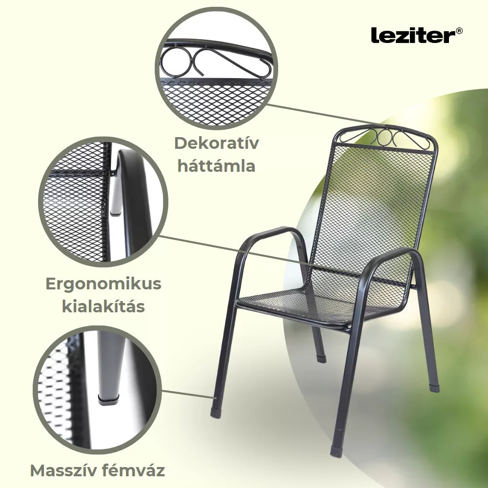 Setul de mobilier de grădină Leziter Viva Balcony de culoare antracit include o masă rotundă de grădină Arko și 2 fotolii de grădină cu brațe Melfi, cu construcția sa robustă din oțel, finisajul rezistent la coroziune și acoperit cu pulbere și designul compact, este alegerea ideală pentru un balcon, o terasă mică sau o grădină.