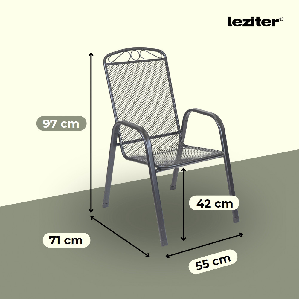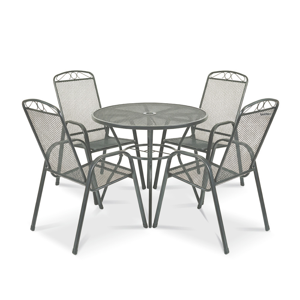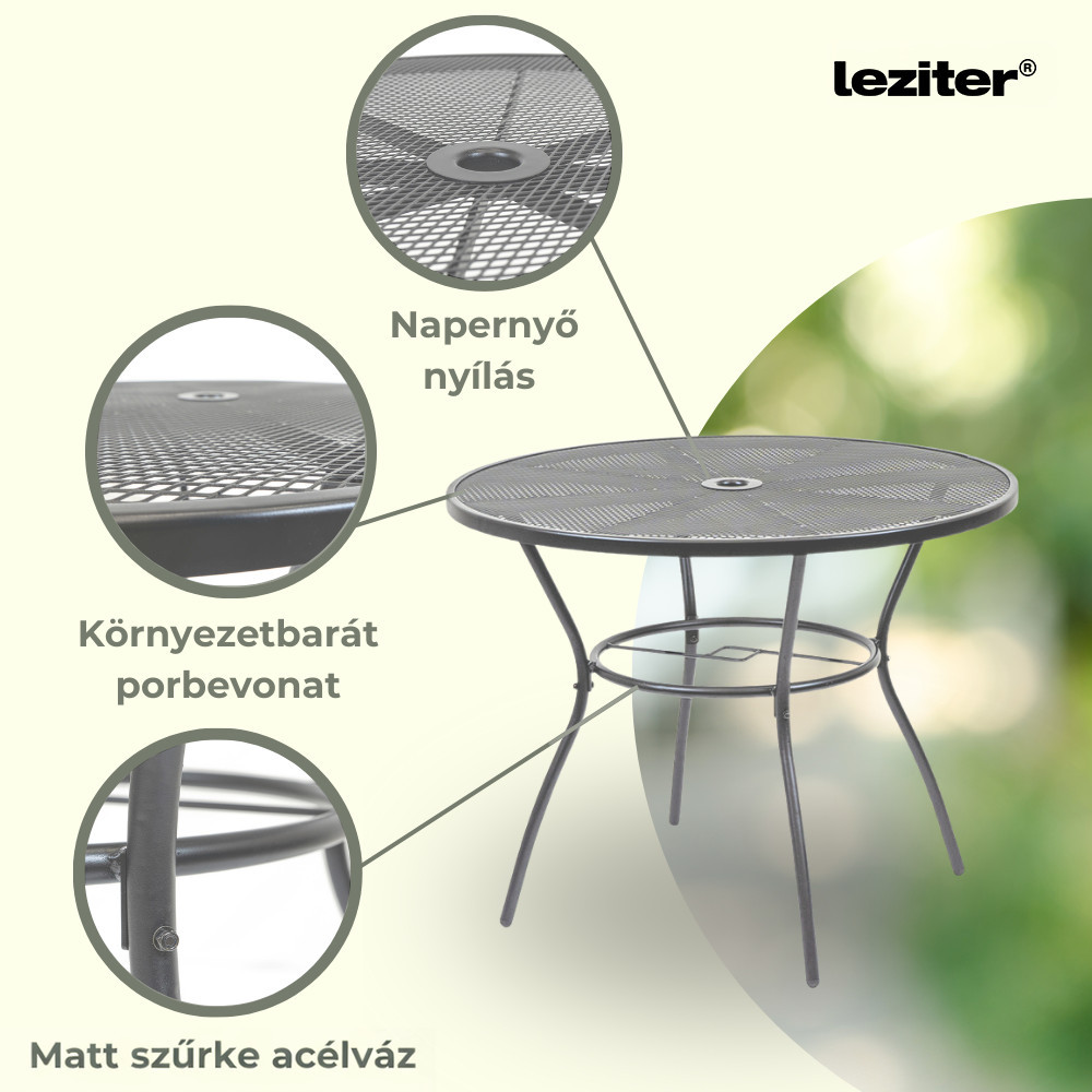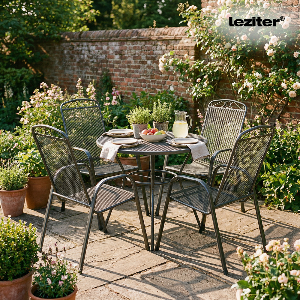 A Leziter Melko 4+1 kerti bútor garnitúra szett antracit színben egy Arko kerek kerti asztalt és 4 db kényelmes Melfi karfás széket tartalmaz, stabil acél szerkezetével, korrózióálló és porszórt felületkezelésével, valamint modern hálós kialakításával tartós és stílusos megoldást kínál kertbe, teraszra vagy erkélyre.