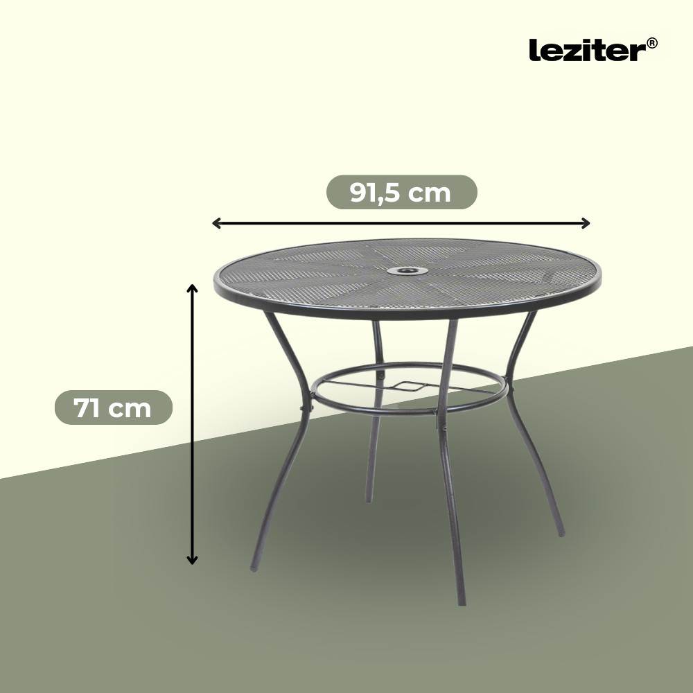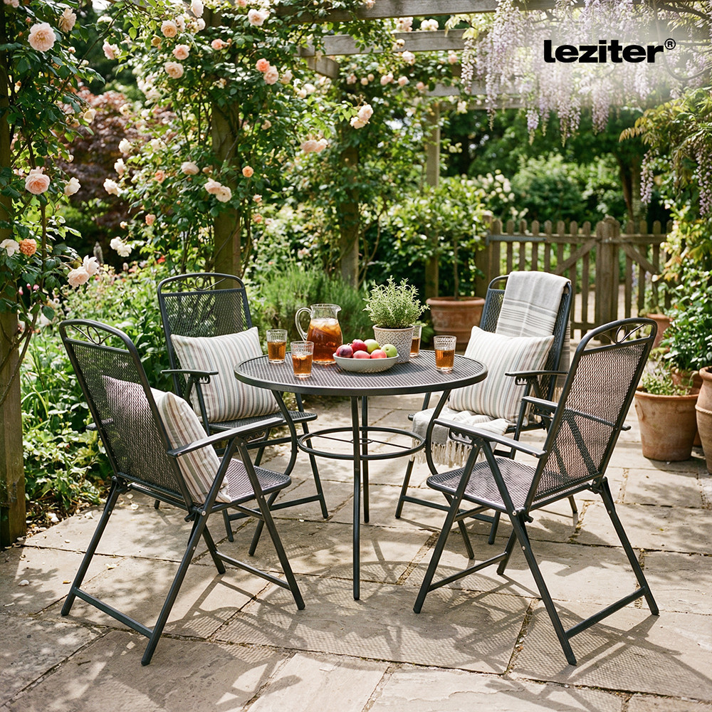 A Leziter Aral 4+1 kerti bútor garnitúra szett antracit színben egy Arko kerek kerti asztalt és 4 db Alba összecsukható kerti széket tartalmaz, stabil acél szerkezetével, korrózióálló és porszórt felületkezelésével, valamint praktikus napernyőnyílásával és helytakarékos kialakításával ideális választás kertbe, teraszra vagy erkélyre.