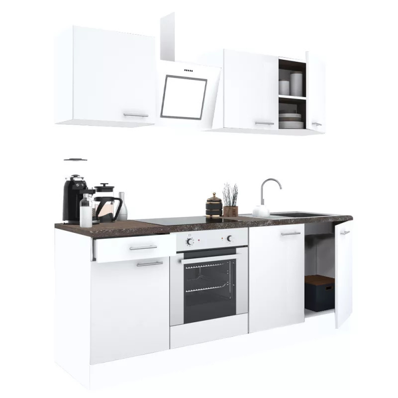 Mobilier de bucătărie modular de înaltă calitate, produs în țară, care va satisface nevoile oricărui client. Corp fabricat din placă de mobilier laminată de 16 mm , de culoare albă. Când este asamblat, pinii ombilicali și șuruburile de confirmare îl fac suficient de solid. Blatul de lucru este fabricat dintr-o singură piesă deasupra elementelor și are o grosime de 38 mm .