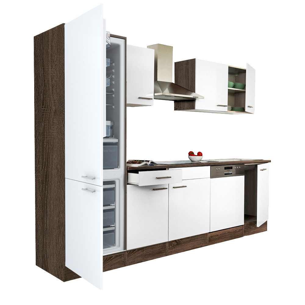Mobilier de bucătărie modular de înaltă calitate, produs în țară, care va satisface nevoile oricărui client. Corp realizat din placă laminată pentru mobilier de 16 mm , de culoare stejar York. Când este asamblat, pinii ombilicali și șuruburile de confirmare îl fac suficient de solid. Blatul de lucru este fabricat peste elemente și are o grosime de 28 mm .