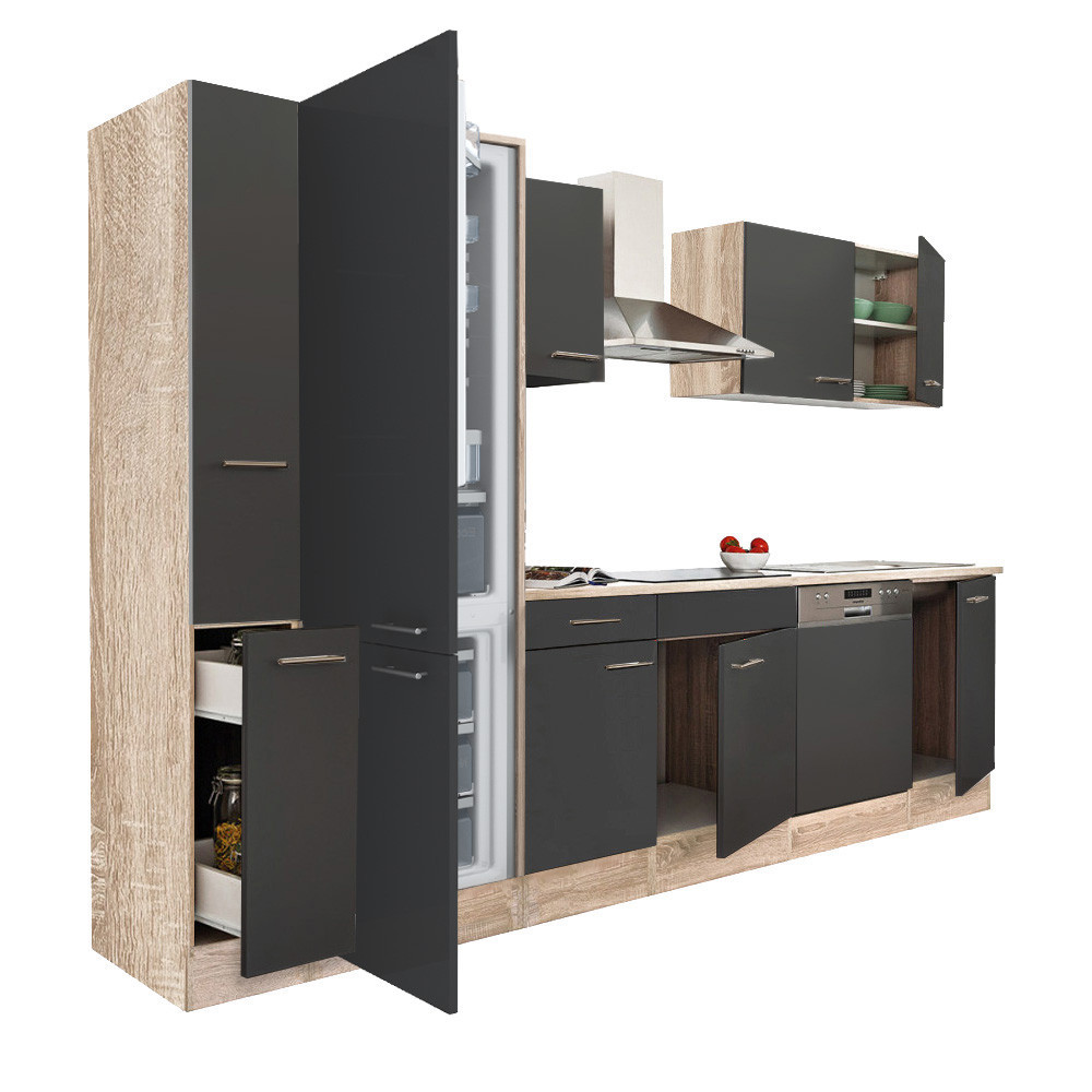 Mobilier de bucătărie modular de înaltă calitate, produs în țară, care va satisface nevoile oricărui client. Corp realizat din placă laminată pentru mobilier de 16 mm , de culoare stejar York. Când este asamblat, pinii ombilicali și șuruburile de confirmare îl fac suficient de solid. Blatul de lucru este fabricat peste elemente și are o grosime de 28 mm .