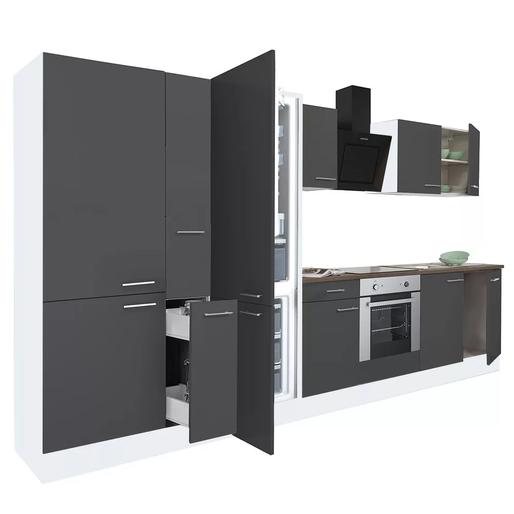 Mobilier de bucătărie modular de înaltă calitate, produs în țară, care va satisface nevoile oricărui client. Corp realizat din placă laminată pentru mobilier de 16 mm , de culoare stejar York. După asamblare, pinii ombilicali și șuruburile de confirmare îl fac suficient de solid. Blatul de lucru este fabricat dintr-o singură piesă peste elemente și are o grosime de 38 mm .