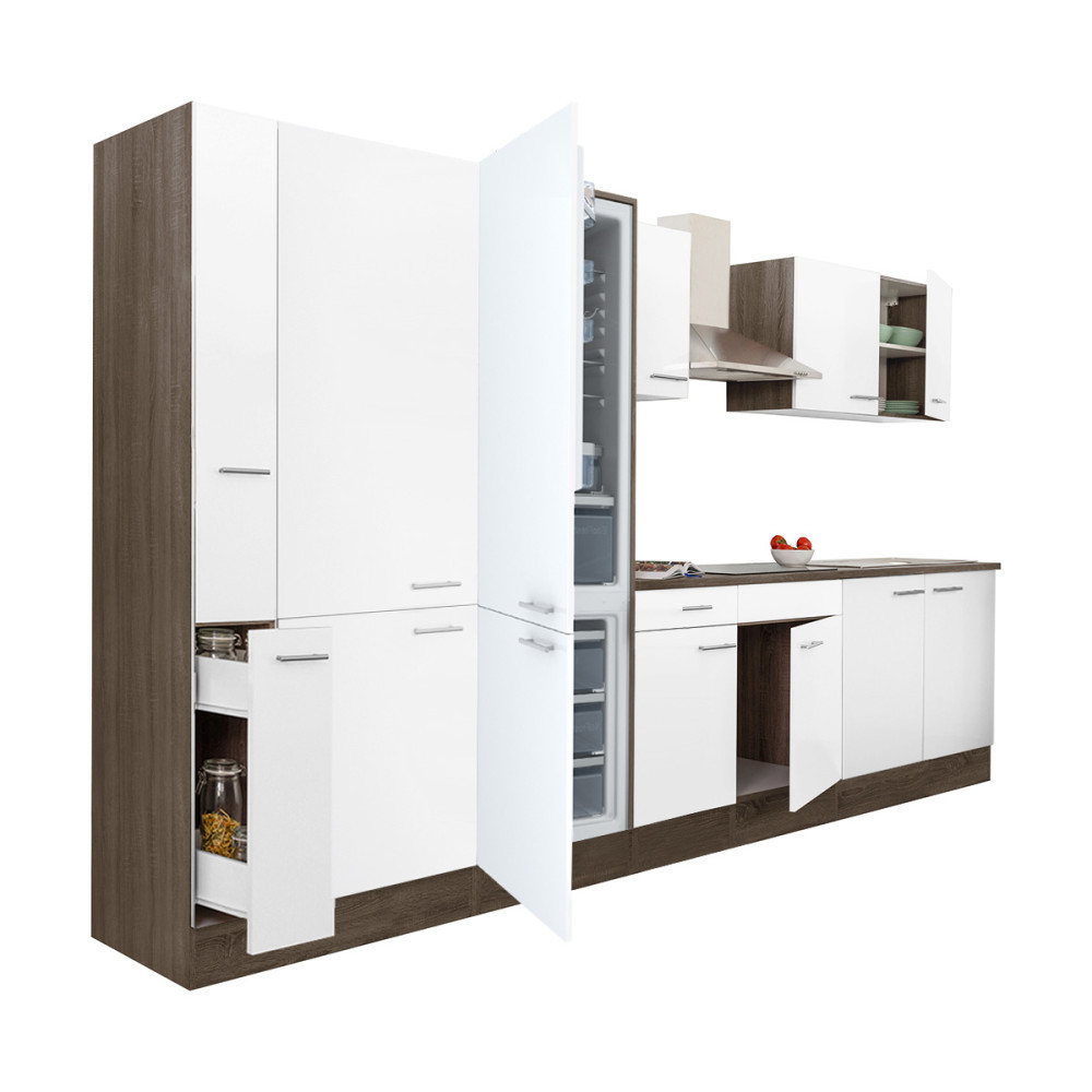 Dulapurile laterale de depozitare ale acestui produs pot fi asamblate în mai multe moduri . Cu un dulap cu rafturi și un frigider cu congelator inferior.