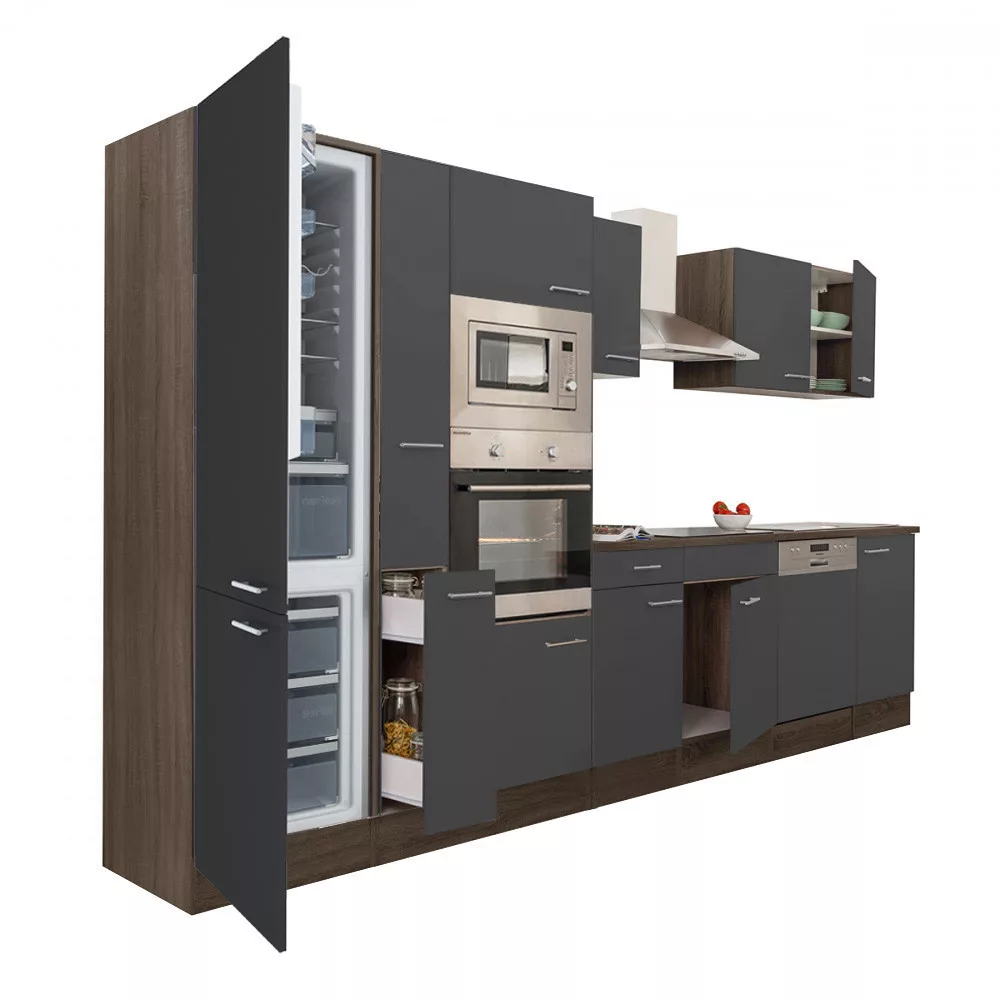 Mobilier de bucătărie modular de înaltă calitate, produs în țară, care va satisface nevoile oricărui client. Corp realizat din placă laminată pentru mobilier de 16 mm , de culoare stejar York. Când este asamblat, pinii ombilicali și șuruburile de confirmare îl fac suficient de solid. Blatul de lucru este fabricat peste elemente și are o grosime de 28 mm .