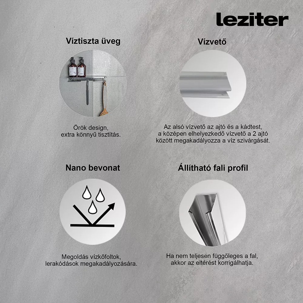 Paravanul de baie Eva are multe caracteristici pozitive. Este echipat cu o duză de apă inferioară care previne scurgerile de apă. Sticla securizată de 6 mm este fabricată cu un nano-acoperire care previne aderarea pe sticlă a petelor și depunerilor de calcar. Profilul pivotant montat pe perete permite o deschidere ușoară și fără probleme, iar paravanul de baie este, de asemenea, echipat cu un mecanism de ridicare .
