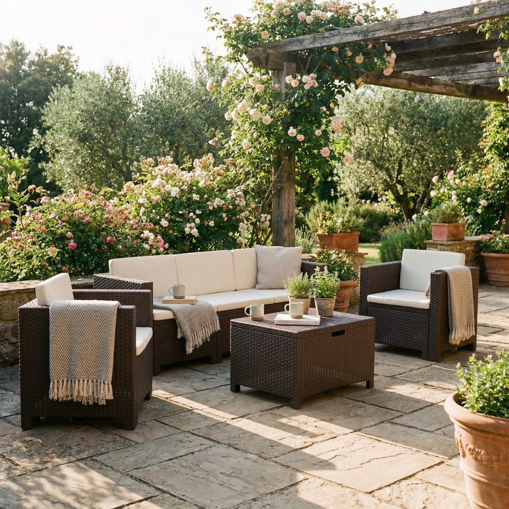 Suprafața originală cu structură de ratan și scaunele confortabile ale fotoliilor și canapelei garantează o durată lungă de viață. Terasele, balcoanele și grădinile din jurul casei sunt locuri perfecte pentru întâlniri cu familia și prietenii. Vă puteți face timpul petrecut acolo și mai plăcut cu mobilierul elegant al spațiului și mobilierul confortabil de grădină.